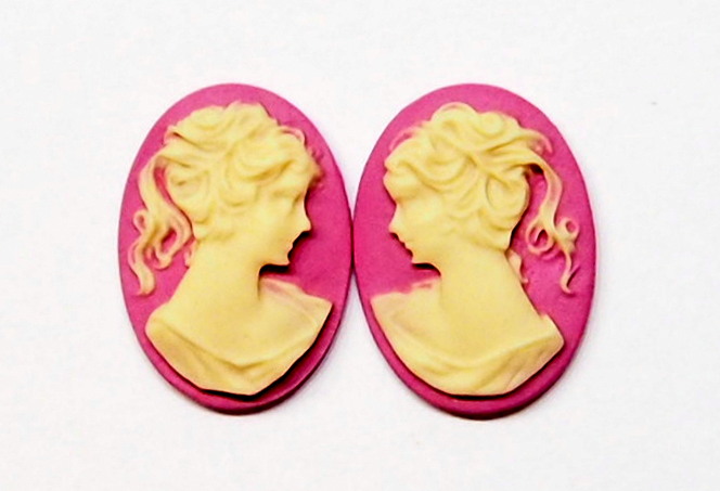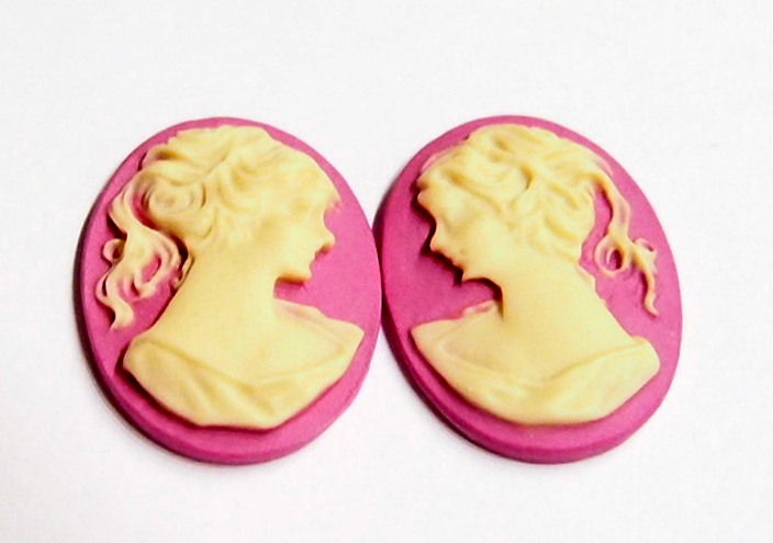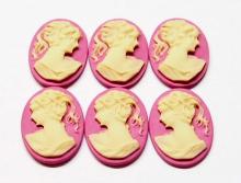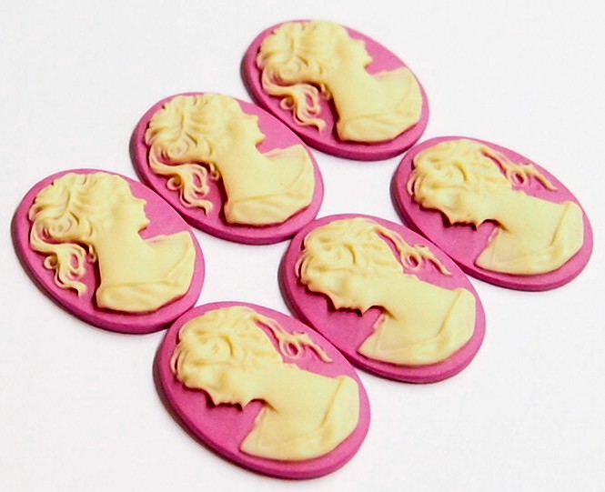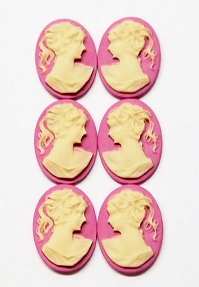You are buying 6 of 25 mm x 18 mm Cream over Pink Classic Ponytail Lady Cameos, Left & Right. There are three Lefts and three Right facing so earrings or charms could be made with these. These are gorgeous, this shows a beautiful Victorian Woman with her ponytail. They look very detailed for their size, in fact, they stand out from the background to give it a 3-D look. She is Cream with a Pink Background. I have several different settings these will fit in. They look very detailed for their size. I have lots of Great Bails, Bracelets, Cameos, Chains, Connectors, Jump Rings, Lockets, Pendants, Pins, Rings & Settings so, just look at all my listings. I have these in 1 other Color & in a group of 10 Colors as shown in the next to last picture item #111355292115. These are also offered in a group of 3 different sets of beautiful & colorful Cameos as shown in the last picture item #110930805536.