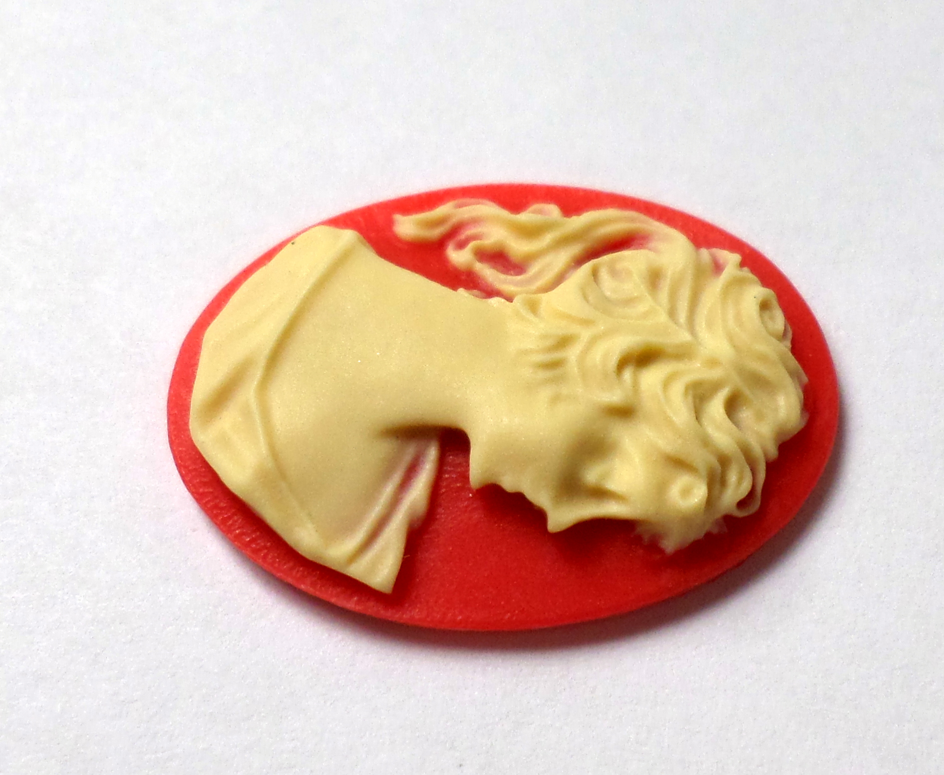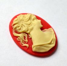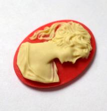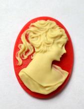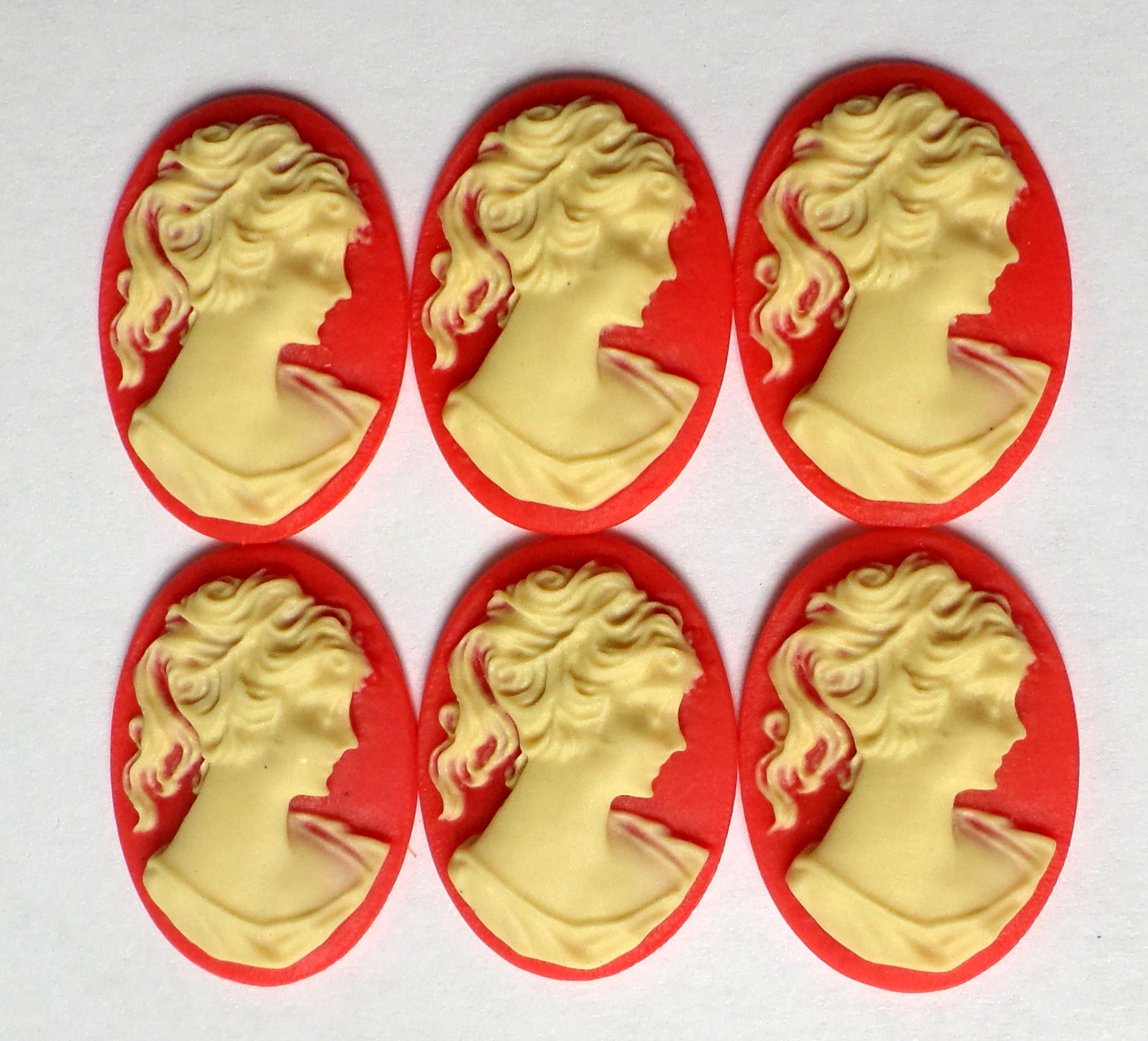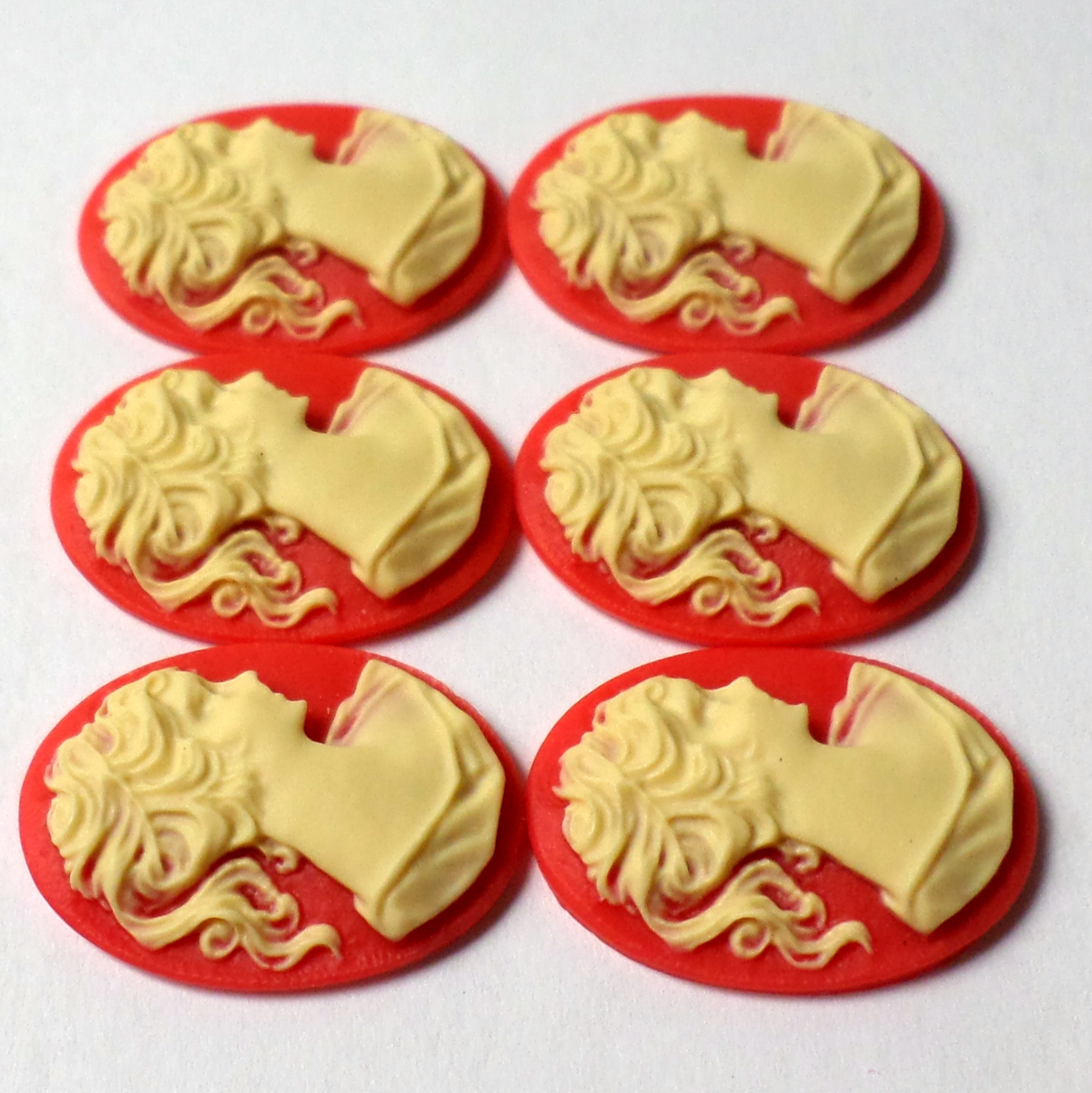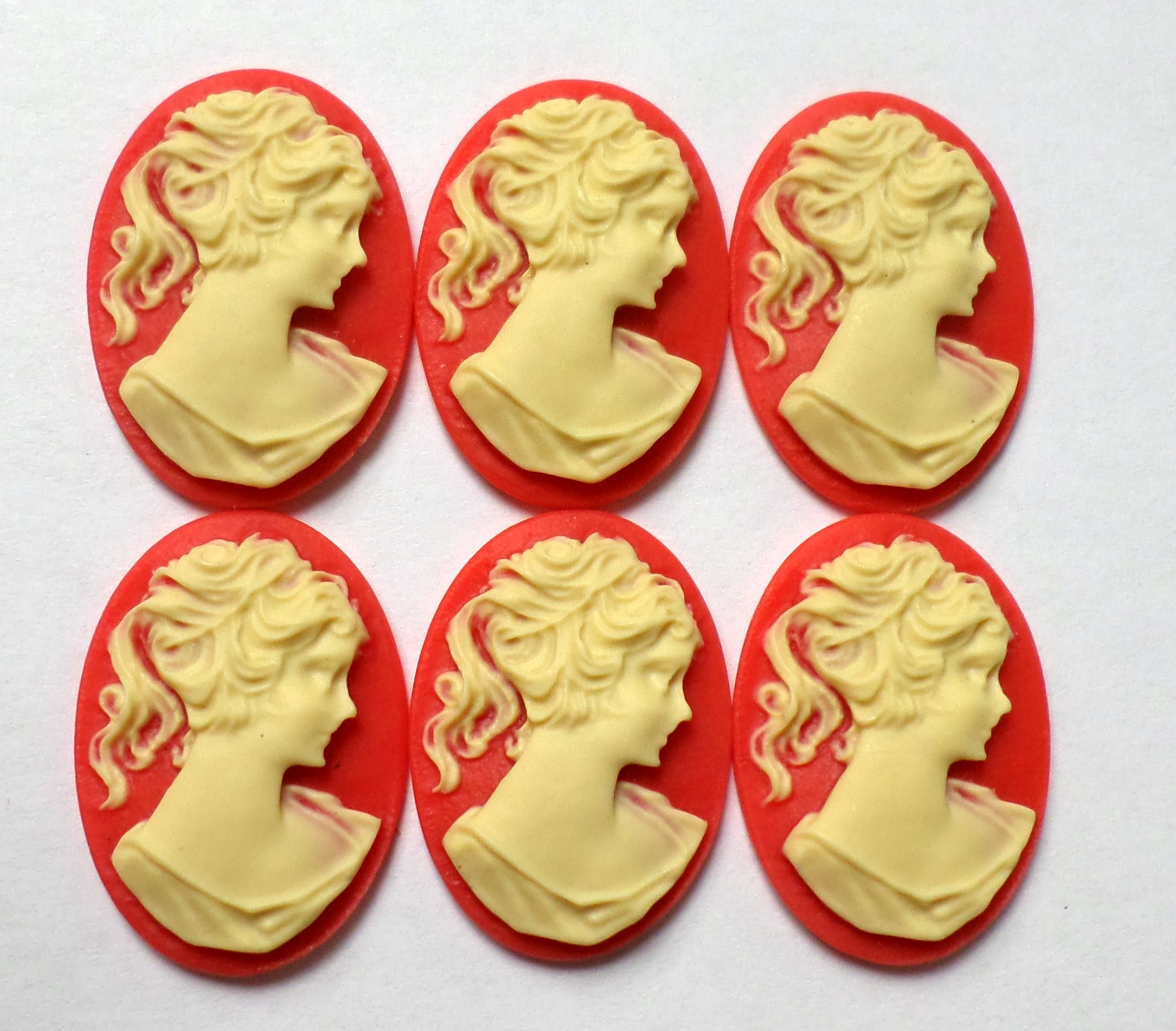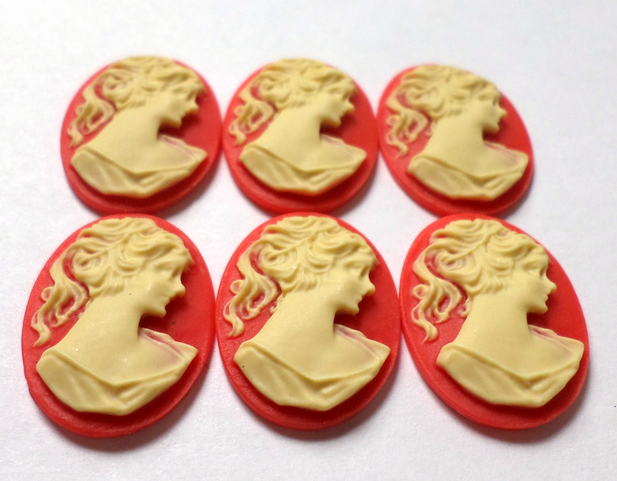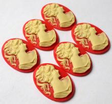 You are buying 6 of 25 mm x 18 mm Cream over Red Ponytail Lady Cameos. These are gorgeous, this shows a beautiful Victorian Woman with her ponytail. She is a cream color over a red background. These measure 25 mm x 18 mm. I have lots of different 25x18 mm settings these will fit in. They look very detailed for their size. I have lots of Great Bails, Bracelets, Cameos, Chains, Connectors, Jump Rings, Lockets, Pendants, Pins, Rings & Settings so, just look at all my listings. I have these in 6 other Colors & in a group of 10 Colors as shown in the last picture item #111355292115, sold separately.