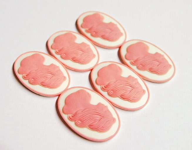 You are buying 6 of 25 mm x 18 mm Pink over White Swept Back Hair Woman Cameos, Facing Left with Bare Shoulders. They are of a beautiful lady with swept back hair which is Pink over White with a matching thin border facing left with bare shoulders in a fabulous pose. The details are very sharp and stand away from the background, giving it a 3-D effect. I have several different settings these will fit in to. They measure 25 mm x 18 mm. They look very detailed for their size. I have lots of Great Bails, Bracelets, Cameos, Chains, Connectors, Jump Rings, Lockets, Pendants, Pins, Rings & Settings so, just look at all my listings. I have these in 2 other colors Cream over Black item #360471675587 & Black over White item #360471675569 as shown in the last 2 pictures. I also have these in 38x26 mm in 2 Colors.
