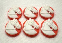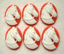 You are buying 6 Vintage Molded Resin Cameos. They are of a portrait of a horse's head, very cute, these are molded. The images stands out from the cameo to give you the 3-d effect. They are a white color to a Reddish Orange background. They measure 25 mm x 18 mm They look very detailed for their size. I have lots of great cameos, settings, connectors and pendants so, just look at all my listings.