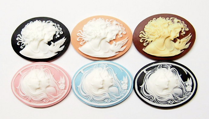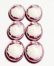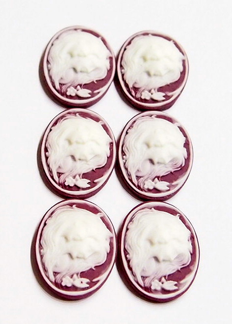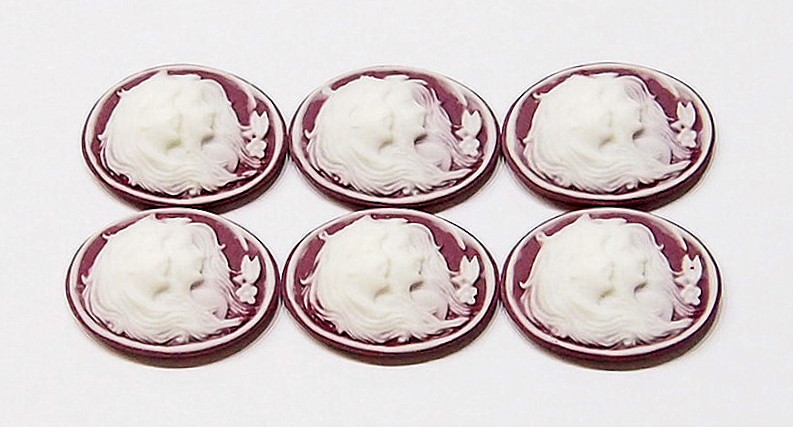 You are buying 6 of 25 mm x 18 mm Horizontal White over Plum Sisters/Mother/Daughters or Twins Cameos. They are of Sisters or Mother & Daughter, either one, the molding is very well done. They are a gorgeous white color to a Plum background. They measure 25 mm x 18 mm & are Horizontal in orientation. The details are very sharp and stand away from the background, giving it a 3-D effect. I have lots of Great Bails, Bracelets, Cameos, Chains, Connectors, Jump Rings, Lockets, Pendants, Pins, Rings & Settings so, just look at all my listings. I have these in 1 other Color. I also have these in a group of 6 colors in 40x30 mm as shown in the last picture item #360724150923.