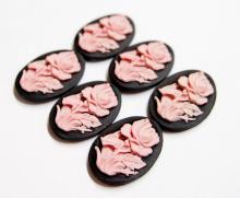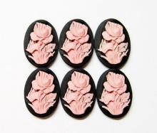 You are buying 6 of 25 mm x 18 mm Pink over Black Blooming Rose Cameos. These are so gorgeous, they are a large Rose on stem with leaves all around with the cameos being Pink and the background is Black. The flower takes up most of the whole cameo. I have several different settings these will fit in. They fit into the 25 mm x 18 mm settings I have listed. These are pretty fabulous. They look very detailed for their size. I have lots of Great Bails, Bracelets, Cameos, Chains, Connectors, Jump Rings, Lockets, Pendants, Pins, Rings & Settings so, just look at all my listings. These are also offered in a gorgeous group of 10 different colors and 4 styles of 25x18 flower cameos as shown in the next to last picture item #360929722102. The last picture is a group of 12 different 40x30 mm flower cameos item #110911248686.