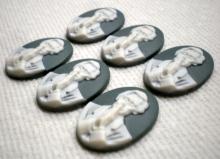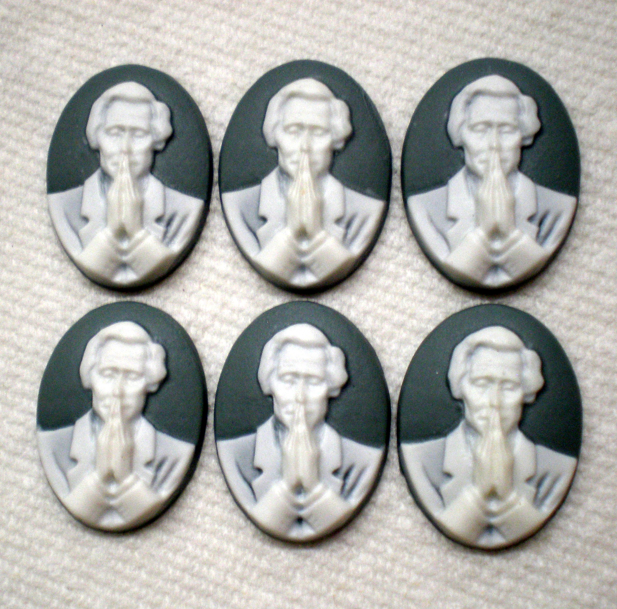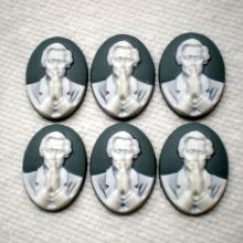 You are buying 6 Molded Cameos. They are of Abe Lincoln or a Colonial Man Praying, the molding is very well done. They are a White on gray background. They measure 25 mm x 18 mm. They look very detailed for their size, in fact, they stand out from the background to give it a 3-D look. I have lots of great cameos, settings, connectors and pendants so, just look at all my listings.