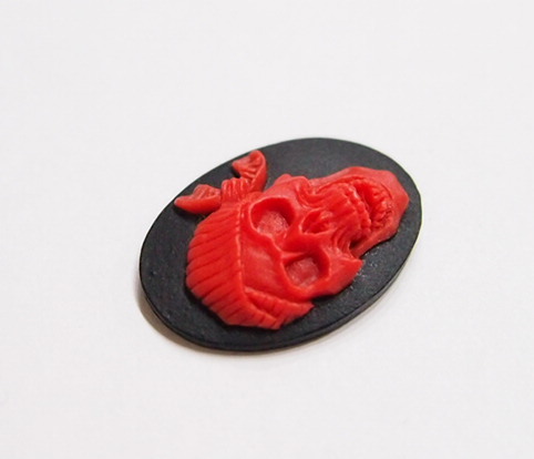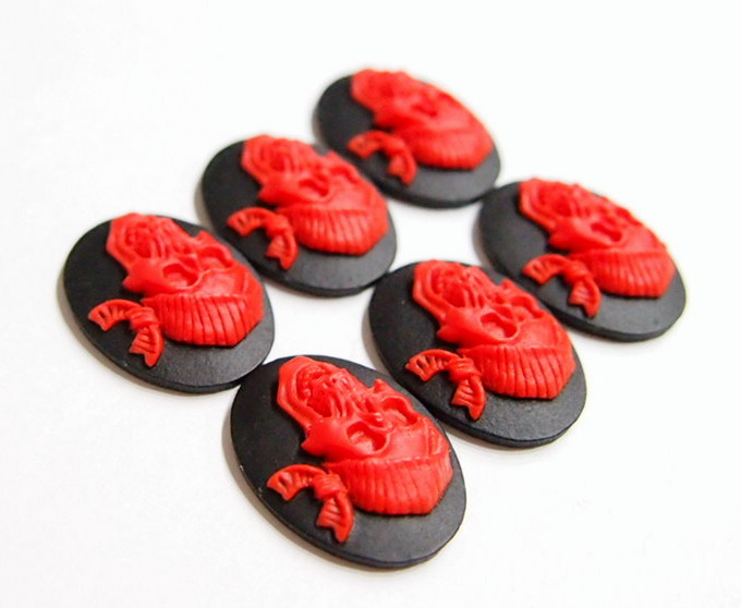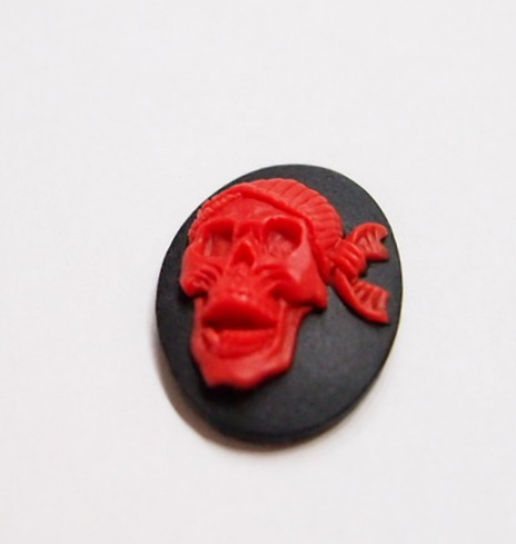 You are buying 6 of 25 mm x 18 mm Red over Black Skull with Bandana Cameos. They are of a Skull with Bandana on, Pirates beware, the molding is very well done. They are Red on a Black Background. I really like the color combination. These measure 25 mm x 18 mm. I have them in all sorts of colors and sizes, so check my other listings. They look very detailed for their size, in fact, they stand out from the background to give it a 3-D look. They have never been used. I have lots of Great Bails, Bracelets, Cameos, Chains, Connectors, Jump Rings, Lockets, Pendants, Pins, Rings & Settings so, just look at all my listings. I have these in 5 other Colors & in a group of 6 Colors as shown in the last picture. I also have these in several Colors of 40x30 mm.