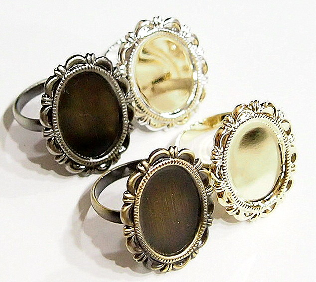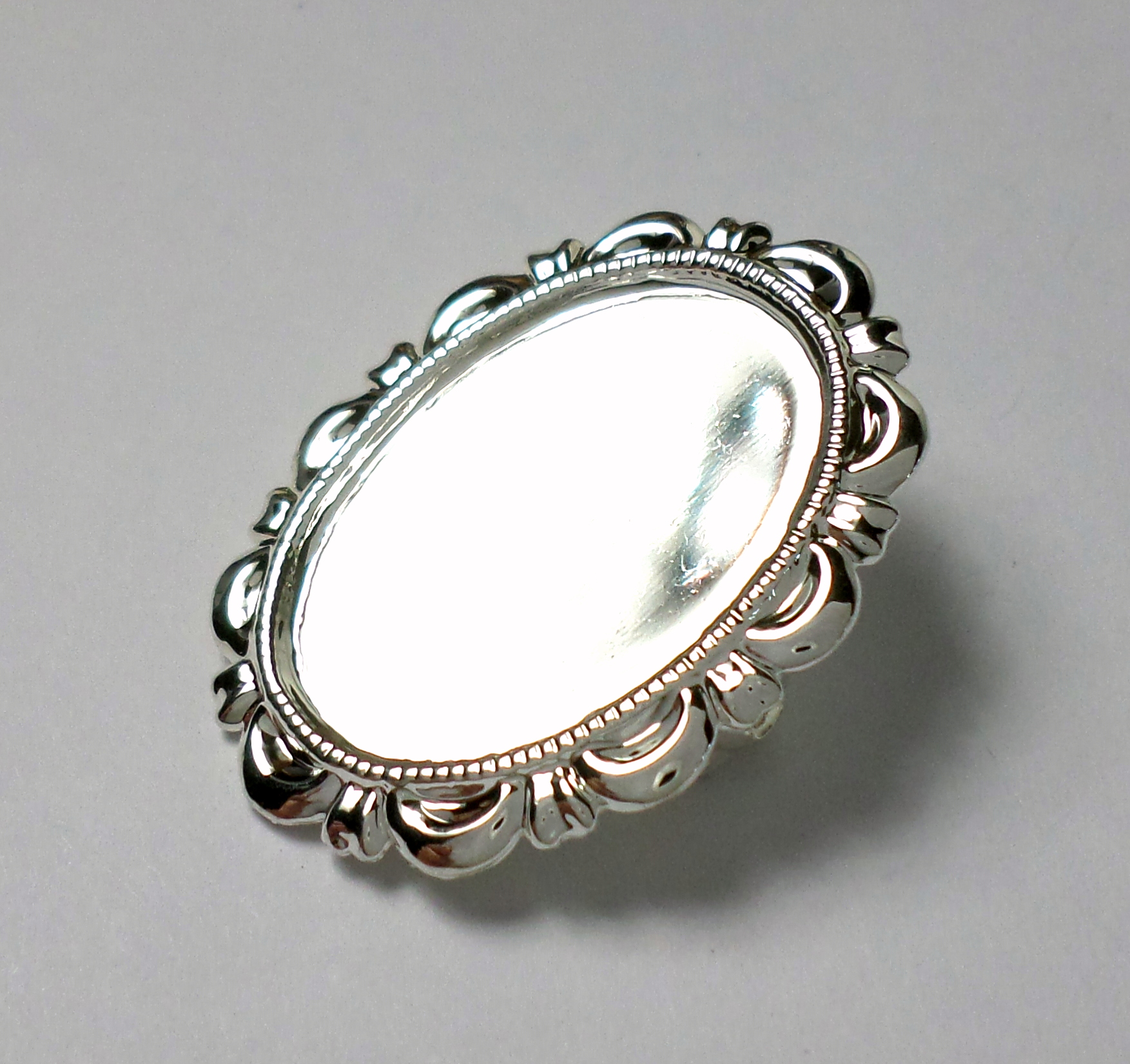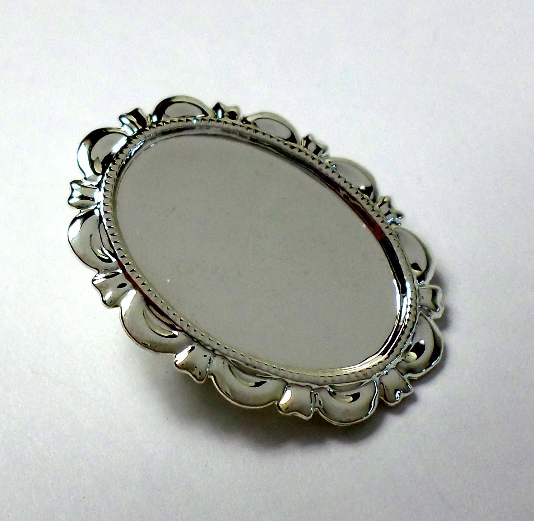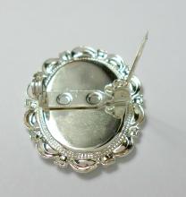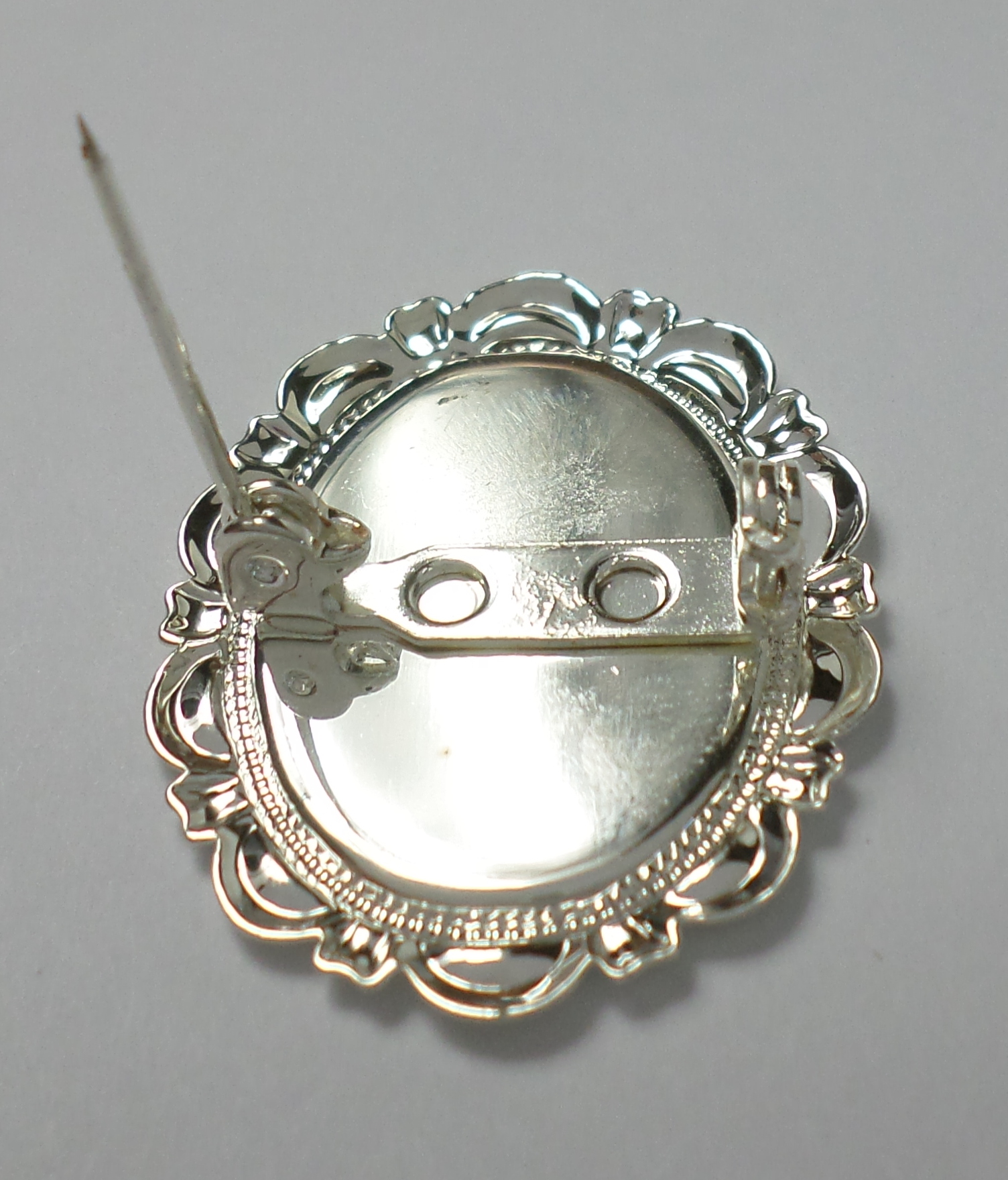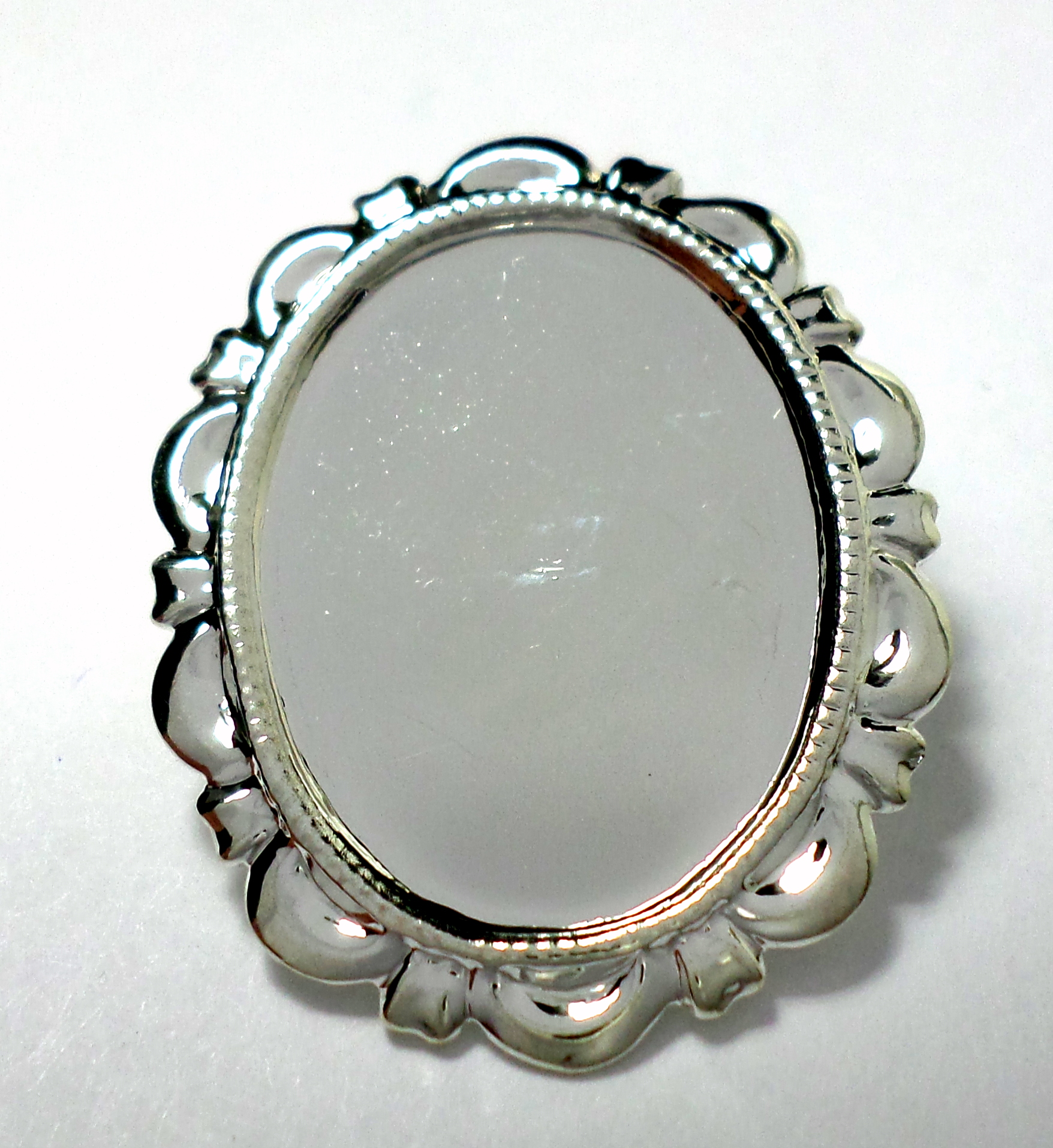 You are buying 6 of 25 mm x 18 mm Shiny Silver Plated Closed Loop Pin Settings. These are lightweight & sturdy. These will work great for any cameos or cabochons, they will have to be glued in. I am showing the front and back of these, so you can see where the pin is located and, it has a locking latch. The biggest size that will fit in these are 25 mm x 18 mm. Since they are a solid back, you could go down in size a little if you have an odd size cameo or cab to try & fit. They have never been used, very nice looking. I have lots of Great Bails, Bracelets, Cameos, Chains, Connectors, Jump Rings, Lockets, Pendants, Pins, Rings & Settings so, just look at all my listings. I also have this design in 4 different colors of rings as shown in the last picture item #360471680384, sold separately. I also have cuff bracelets with this same pattern.