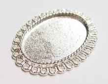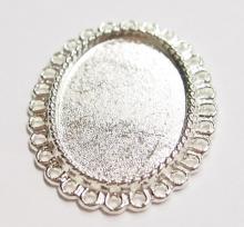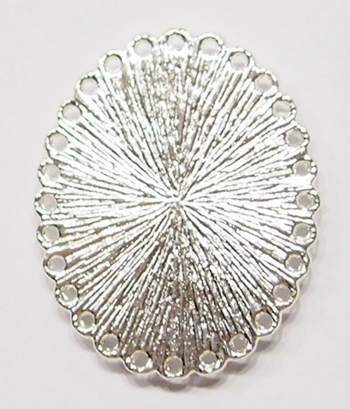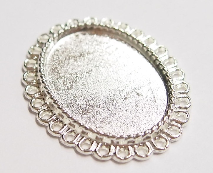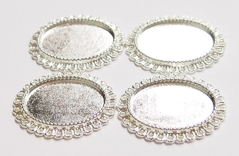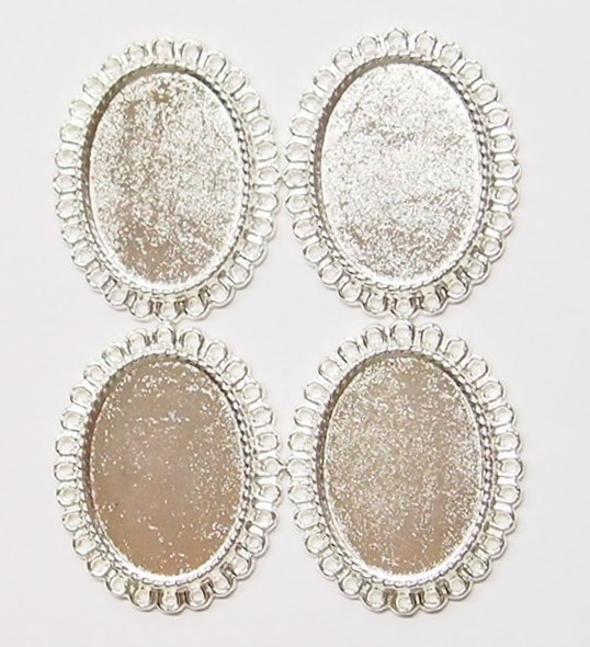 You are buying 4 of 26 mm x 19 mm Shiny Silver Plated Little Loops Pendant Settings. These are a little oversize so if you have a Cameo or Cab your having trouble finding a setting to fit into, these are for you. The actual setting dimensions are 26.3 mm x 19.2 mm & the outer dimensions are 35 mm x 28 mm. You can use these either Horizontal or Vertical. You can still use these for 28x18 Cameos or Cabs you will just have to center it a bit. You will have to glue in any cameos or cabs you want to put into the setting, no prongs and they are very sturdy. The design is very pretty with a scalloped small looped edge all around and the back has a star burst pattern on it. You can put a jump ring either on top or on the sides to make this pendant wear horizontal or vertical. These have never been used. Since they are a solid back, you could go down in size a little if you had an odd size cameo or cab to try & fit. They have a gorgeous Victorian look to them. I have lots of Great Bails, Bracelets, Cameos, Chains, Connectors, Jump Rings, Lockets, Pendants, Pins, Rings & Settings so, just look at all my listings. I have these in 1 other Color & in a group of 2 Colors as shown in the last picture item #111799200852.