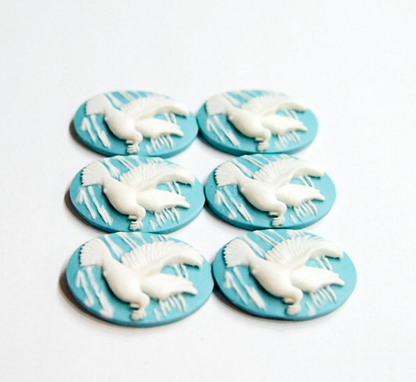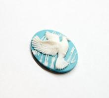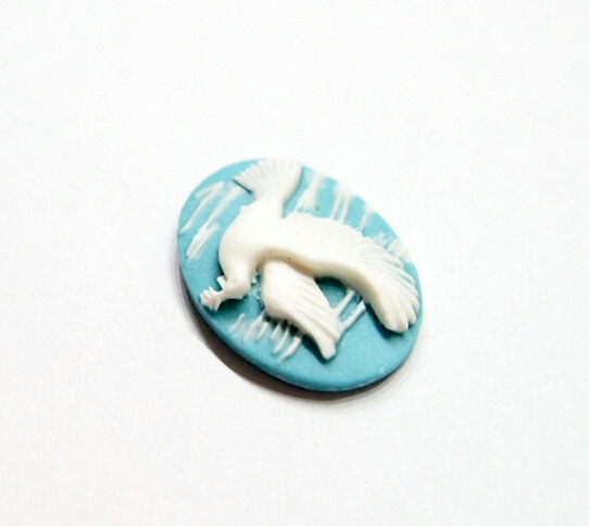 You are buying 6 of 25 mm x 18 mm White over Baby Blue Dove Flying with an Olive Branch in its mouth Cameos. These are so gorgeous, this shows a beautiful Flying Dove with a Olive branch in its mouth. The Dove is White over a Baby Blue background. A very pretty color combination. The Dove practically fills up the entire cameo by itself. The molding process of these are just great, no flaws. I have several different settings these will fit in. They measure 25 mm x 18 mm. They look very detailed for their size. I have lots of Great Bails, Bracelets, Cameos, Chains, Connectors, Jump Rings, Lockets, Pendants, Pins, Rings & Settings so, just look at all my listings. I have three other Bird Cameos and in a group of 15 as shown in the last picture item #111175401253.