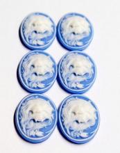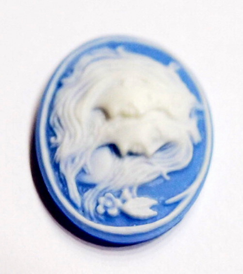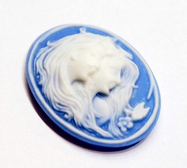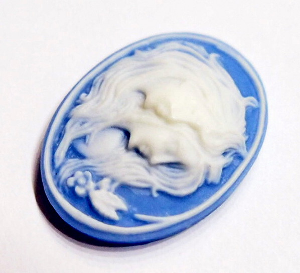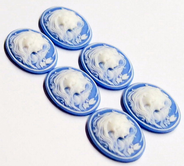 You are buying 6 of 25 mm x 18 mm White over Baby Blue Sisters/Mother/Daughters or Twins Horizontal Cameos. They are of Sisters or Mother & Daughter, either one, the molding is very well done. They are a gorgeous white color to a Baby Blue background. They measure 25 mm x 18 mm & are Horizontal in orientation. They look very detailed for their size, in fact, they stand out from the background to give it a 3-D look. I have lots of Great Bails, Bracelets, Cameos, Chains, Connectors, Pendants, Pins, Rings & Settings so, just look at all my listings. I have these in 2 other Colors. I also have these in several colors in 40x30 mm.