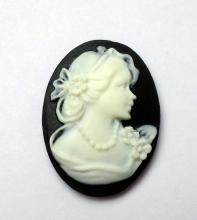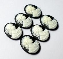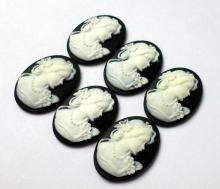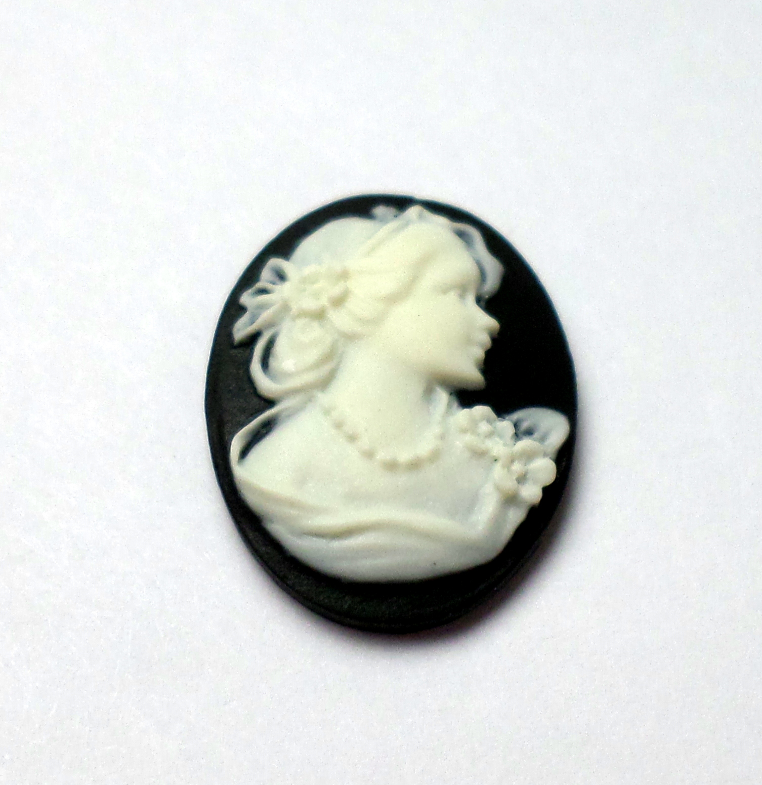 You are buying 6 of 25 mm x 18 mm White over Black Victorian Style Corsage & Pearls Cameos. These are of a beautiful Woman with her hair up and looking toward the right with a corsage. She has a pearl necklace, and wearing a low cut gown. The cameo is White over a Black color Background. These are fashioned after the older style of Cameos. They measure 25x18 mm. They look very detailed for their size. I have lots of Great Bails, Bracelets, Cameos, Chains, Connectors, Jump Rings, Lockets, Pendants, Pins, Rings & Settings so, just look at all my listings. I have these in 5 other Colors & in a group of 6 different Colors for a total of 6 gorgeous 25x18 mm Cameos as shown in the next to last picture item #361510316187. I also offer a group of 10 different 25x18 mm beautiful Grecian Women Cameos as shown in the last picture item #360935670102.