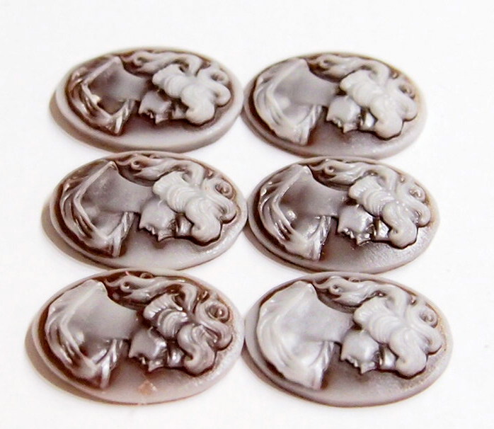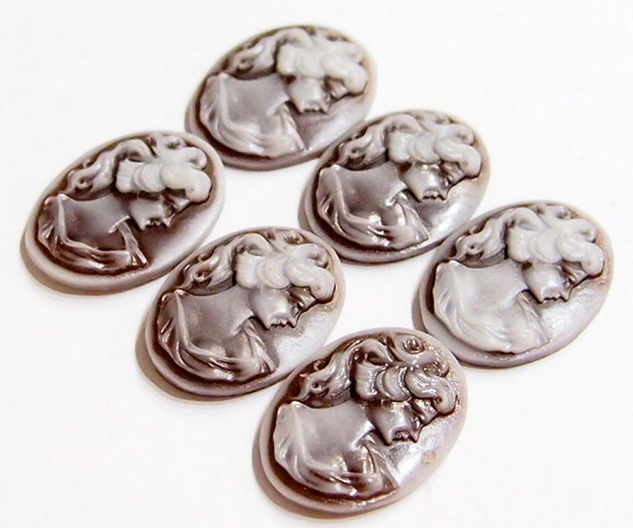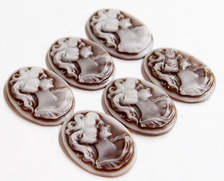 You are buying 6 of 25 mm x 18 mm White over Brown Ponytail Lady Cameos. These are gorgeous, these show a beautiful Victorian Woman with her ponytail & she is Right Facing. She is an off white that blends into a brownish Background (two different colors). These actually measure 24 mm x 18 mm, and will fit into a 25 mm x 18 mm just fine you just have to center it a bit. I have several different settings these will fit in. They look very detailed for their size. I have lots of Great Bails, Bracelets, Cameos, Chains, Connectors, Jump Rings, Lockets, Pendants, Pins, Rings & Settings so, just look at all my listings. I have these in 9 other Colors & in a group of 10 Colors as shown in the last picture item #111355292115. I also have these in lots of Colors in 18x13 & 40x30 mm.