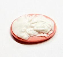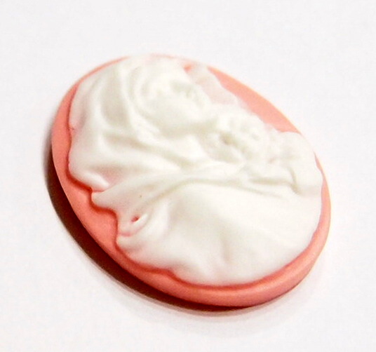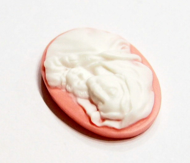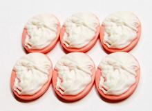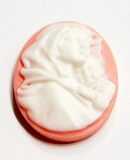 You are buying 6 of 25 mm x 18 mm White over Pink Virgin Mary Cradling Baby Jesus Cameos. They are of the Beautiful Virgin Mary with baby Jesus, held tight to her shoulder, these are molded. The images stand out from the cameo to give you the 3-d effect. They are a White color over a Pink color background. They measure 25 mm x 18 mm. These are simply gorgeous and show Mary cradling her Jesus. They look very detailed for their size. I have lots of Great Bails, Bracelets, Cameos, Chains, Connectors, Jump Rings, Lockets, Pendants, Pins, Rings & Settings so, just look at all my listings. I have more of this style in 40x30 mm.