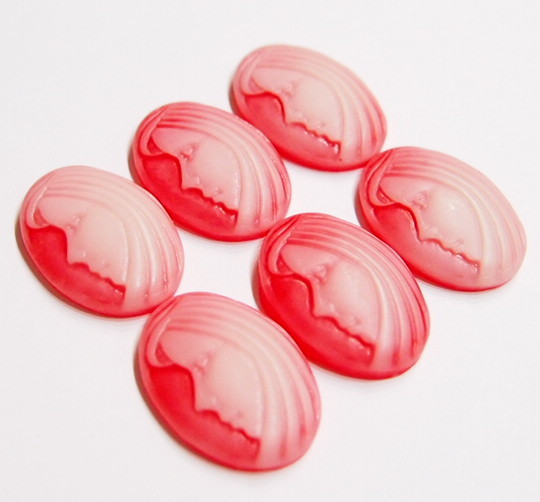 You are buying 6 of 25 mm x 18 mm White over Red Full Face Woman Cameos. These are of a young woman showing the face with her hair running down the side on a red background, she is off white color. She is just gorgeous and measures 25 mm x 18 mm. They look very detailed for their size. I have lots of Great Bails, Bracelets, Cameos, Chains, Connectors, Pendants, Pins, Rings & Settings so, just look at all my listings.