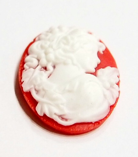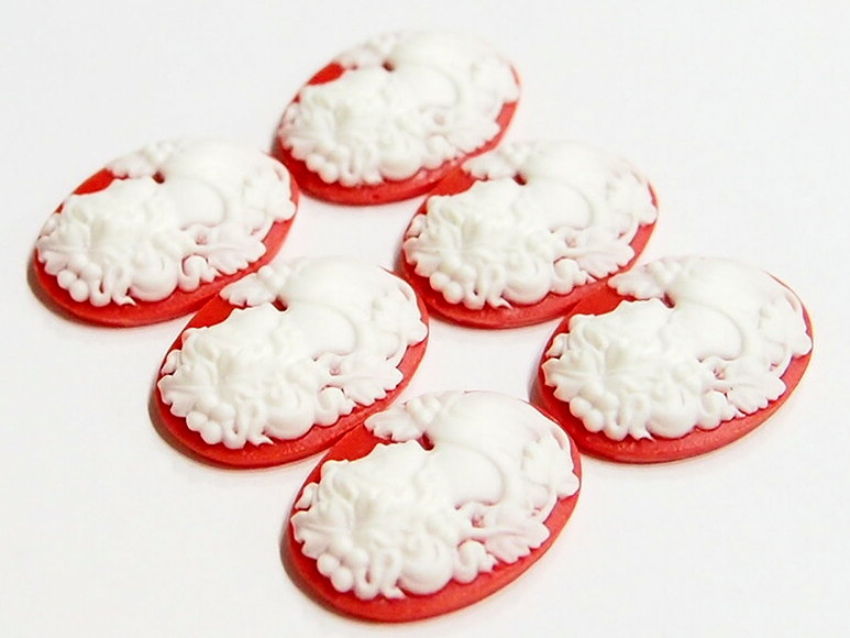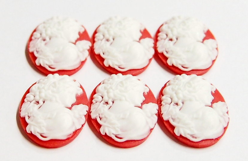 You are buying 6 of 25 mm x 18 mm White over Red Classic Grecian Floral Woman Cameos. These are so gorgeous, this shows a beautiful Classic Grecian woman in a White color on a background of Red. She is just stunning. The molding process of these are just great, no flaws. She has floral surrounding her with a high top gown on. They fit into the 25 mm x 18 mm settings I have listed. These are pretty fabulous and they look very detailed for their size. I have lots of Great Bails, Bracelets, Cameos, Chains, Connectors, Jump Rings, Lockets, Pendants, Pins, Rings & Settings so, just look at all my listings. I have these in 1 other Color & in a group of 10 Colors as shown in the last picture item #360935670102. I also have this style in 40x30 mm in several Colors.