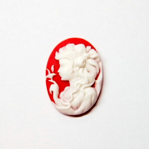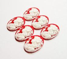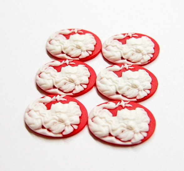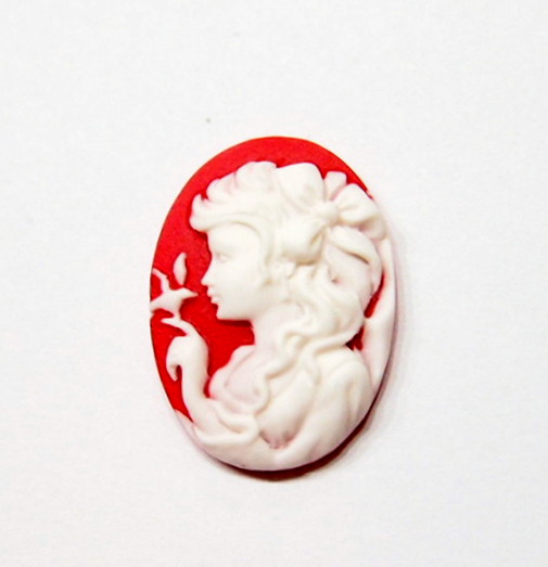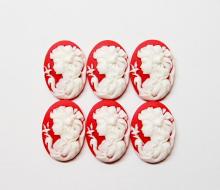 You are buying 6 of 25 mm x 18 mm White over Red Young Girl with a Big Hair Bow and Bird Left Facing Cameos. These are so gorgeous, this shows a beautiful Victorian Young Lady with a big bow in her hair and the finger touching a bird cameos. She is white on a Red Background. She practically fills up the entire cameo by itself and I also have the mirror image of this cameo facing right too. The molding process of these are just great, no flaws. I have several different settings these will fit in. They measure 25 mm x 18 mm. They look very detailed for their size. I have lots of Great Bails, Bracelets, Cameos, Chains, Connectors, Jump Rings, Lockets, Pendants, Pins, Rings & Settings so, just look at all my listings. I have these in 1 other (a Right Facing) & in a group of Paired (with 3 pairs offered in that listing) as shown in the last picture.