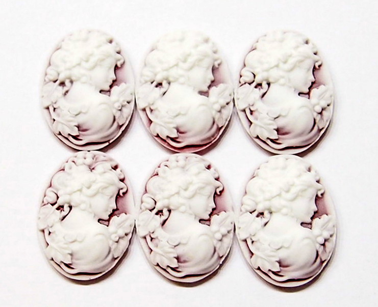 You are buying 6 of 25 mm x 18 mm White over Washed out Red Floral Classic Grecian Woman Cameos. These are so gorgeous, this shows a beautiful Classic Grecian woman in a Washed out White color on a background of Red. She is just stunning. The molding process of these are just great, no flaws. She has floral surrounding her with a high top gown on. They look very detailed for their size, in fact, they stand out from the background to give it a 3-D look. They fit into any of the many 25 mm x 18 mm settings I have listed. These are pretty fabulous and they look very detailed for their size. I have lots of Great Bails, Bracelets, Cameos, Chains, Connectors, Jump Rings, Lockets, Pendants, Pins, Rings & Settings so, just look at all my listings. I have these in 2 other Colors & in 40x30 mm.