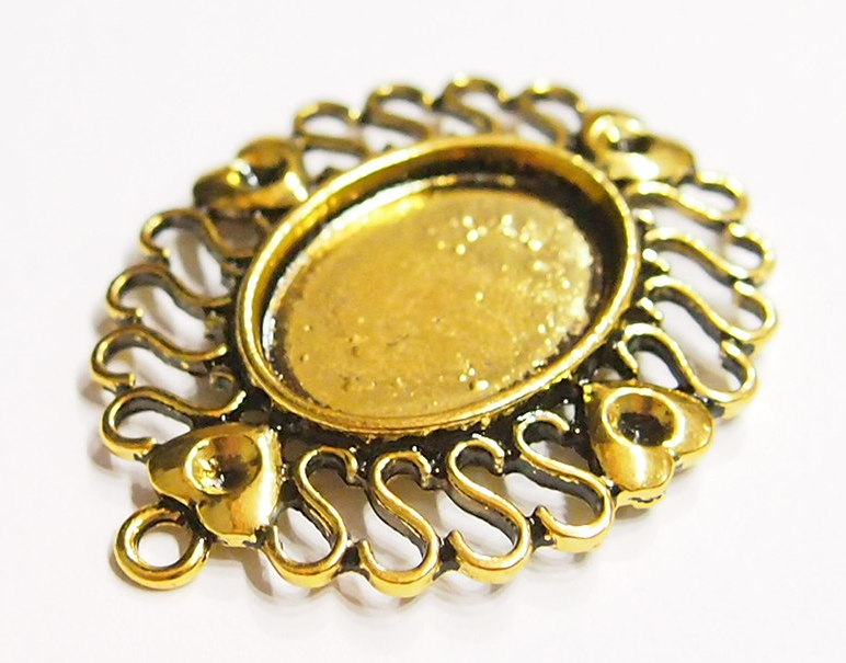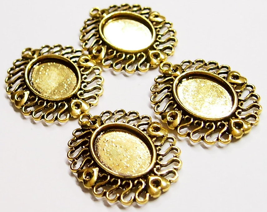 You are buying 4 of 25 mm x 18 mm Antique Gold Plated Four Hearts Twisted S Design Pendant Settings. I had these made with 4 hearts at each end that could hold stones or crystals. You could just leave them alone because they are fancy enough without adding anything. The outside measure 48x37 mm including the loop at the top. The top has a nice size loop (3 mm) for your Chain or Cord or Jump Ring (which I have 3 Colors & 2 Sizes of). The design is just delicate, but they are very solid, not flimsy like the new ones are. You will not be disappointed in the quality, it is excellent and if I was setting any cameos or cabs, I would use these. Since they are a solid back, you could go down in size a little if you had an odd size cameo or cab to try & fit. These will work great for any cameos or cabs, they will have to be glued in. I have lots of Great Bails, Bracelets, Cameos, Chains, Connectors, Jump Rings, Lockets, Pendants, Pins, Rings & Settings so, just look at all my listings. I have these in 3 other Colors & in a group of 4 Colors as shown in the last picture item #110911242489.