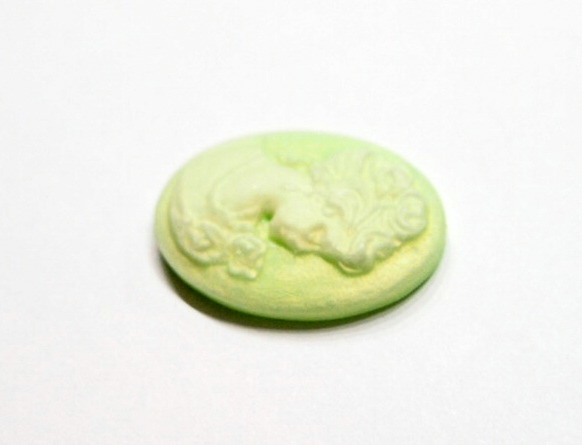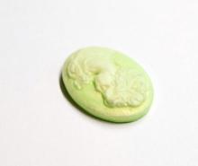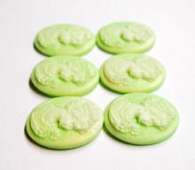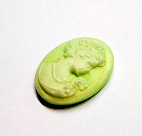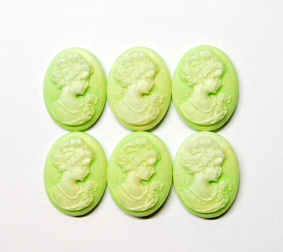 You are buying 6 of 28 mm x 22 mm Pale White over Lime Green Corsage Lady Cameos. They are of a beautiful Victorian Woman with a corsage and a wisp of hair hanging down, she is white that fades into a very pale lime green color Background. They measure 28 mm x 22 mm, they will fit fine into the 30 mm x 22 mm settings I have listed, just have to center it. They look very detailed for their size. I have lots of Great Bails, Bracelets, Cameos, Chains, Connectors, Jump Rings, Lockets, Pendants, Pins, Rings & Settings so, just look at all my listings. I have this same Cameo in several Colors & Sizes.