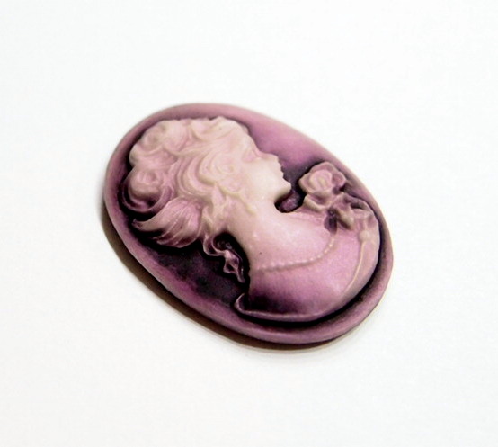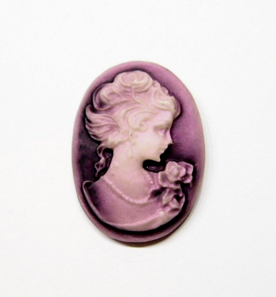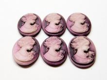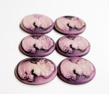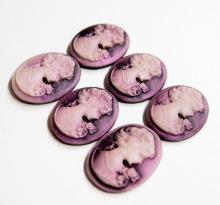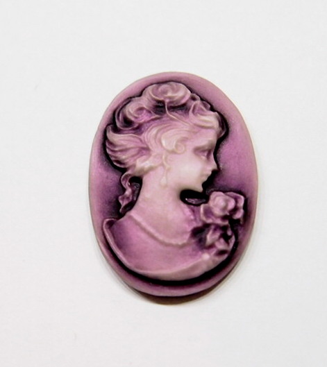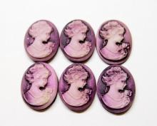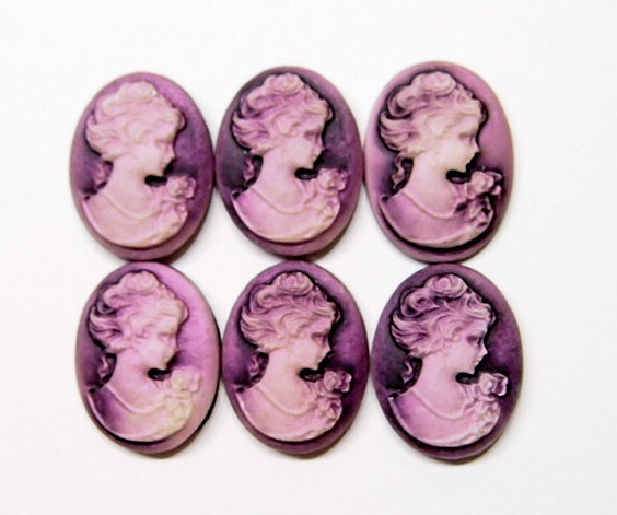 You are buying 6 of 28 mm x 22 mm Purple over Deep Purple Corsage Lady Cameos. They are of a beautiful Victorian Woman with a corsage and a wisp of hair hanging down, she is Pale Purple that fades into a Deep Purple color Background. They measure 28 mm x 22 mm, they will fit fine into the 30 mm x 22 mm settings I have listed, just have to center it when gluing. They look very detailed for their size. I have lots of Great Bails, Bracelets, Cameos, Chains, Connectors, Jump Rings, Lockets, Pendants, Pins, Rings & Settings so, just look at all my listings. I have this same Cameo in 14x10, 18x13, 25x18 & 40x30 mm.