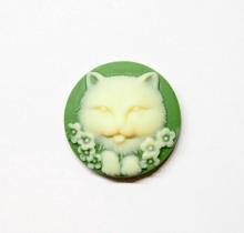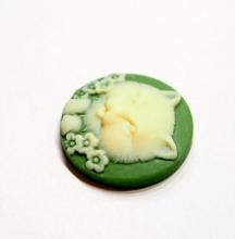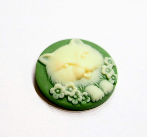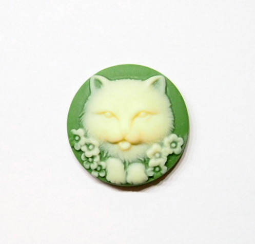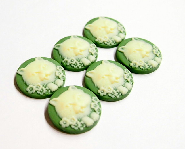 You are buying 6 of 29 mm Cream over Green Round Kitty Cat with Paws Up Front Cameos. This cat is just gorgeous with her little paw in front of her and her tongue just out of her mouth, she is precious. She is all Cream with a floral pattern around her or him on a Green background. They measure 29 mm round and fit into the 30 mm settings I have just perfect. The molding process of these are just great, no flaws. I have several different settings these will fit in. They look very detailed for their size. I have lots of Great Bails, Bracelets, Cameos, Chains, Connectors, Jump Rings, Lockets, Pendants, Pins, Rings & Settings so, just look at all my listings. I also offer a group of 6 Round Cats as shown in the last picture.