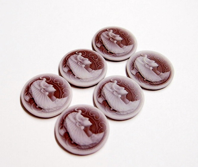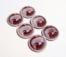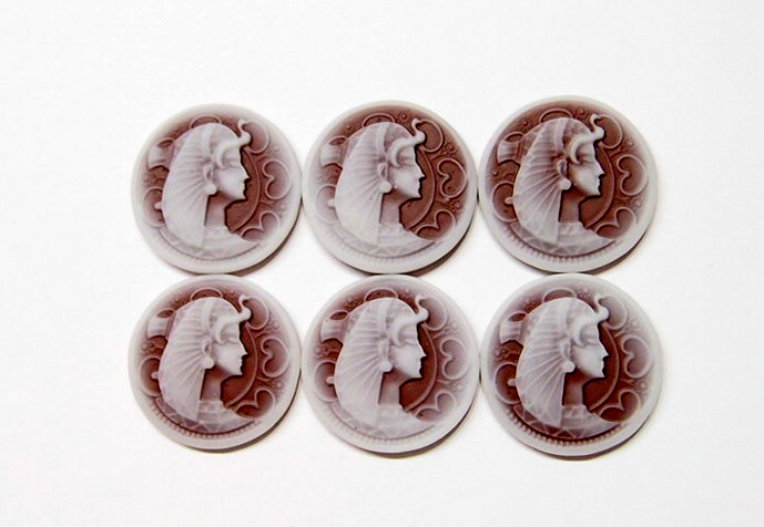 You are buying 6 of 29 mm Round White fades into Brown Classic Egyptian Queen Cameos. This is of the Egyptian Queen and she is facing right. The color is very unusual, it is a light white that actually fades into a Brown color. They measure 29 mm round and fit into a 30 mm setting just perfect. They look very detailed for their size. I have lots of Great Bails, Bracelets, Cameos, Chains, Connectors, Jump Rings, Lockets, Pendants, Pins, Rings & Settings so, just look at all my listings. I have these in 1 other Color.