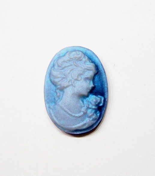 You are buying 6 of 29 mm x 21 mm Blue to Dark Blue Classic Ponytail Lady Cameos. These are gorgeous, this shows a beautiful Victorian Woman with her pearls and floral arrangement on the side of her dress and face. She is Blue to Dark Blue Color. Very Pretty. The molding process of these are just great, no flaws. The size is a 29 mm x 21 mm, these will fit into a 30 mm x 22 mm just fine. I have several different settings these will fit in. They look very detailed for their size. I have lots of Great Bails, Bracelets, Cameos, Chains, Connectors, Jump Rings, Lockets, Pendants, Pins, Rings & Settings so, just look at all my listings.