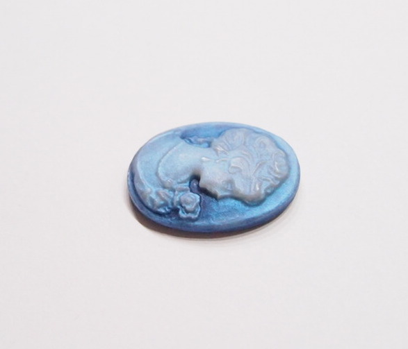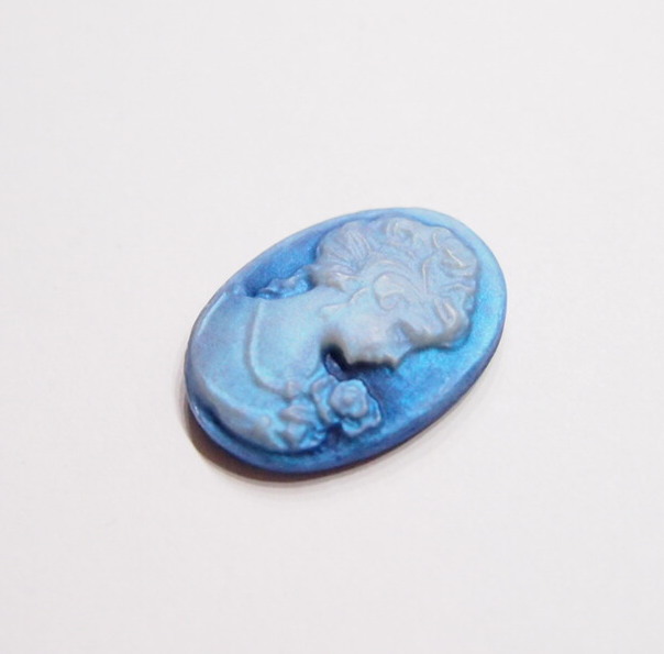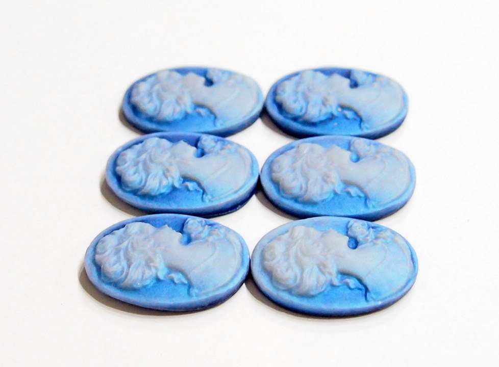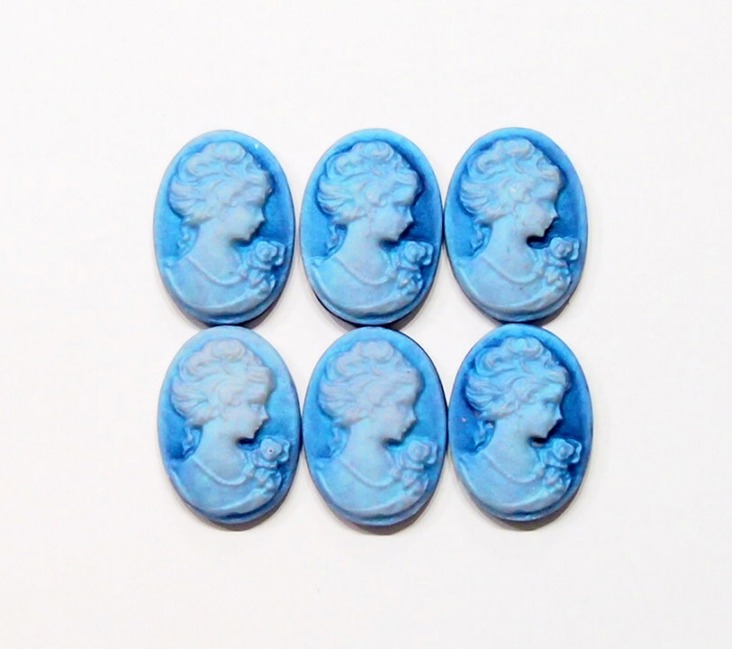You are buying 6 of 28 mm x 20 mm Portland Blue Classic Ponytail Lady Cameos. They are of a beautiful iridescent Portland blue Victorian Woman on a darker Portland blue color Background. They measure 29 mm x 21 mm. They look very detailed for their size. I have lots of Great Bails, Bracelets, Cameos, Chains, Connectors, Jump Rings, Lockets, Pendants, Pins, Rings & Settings so, just look at all my listings. I also have these in 14x10, 18x13, 25x18, & 40x30 mm.