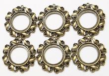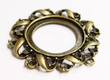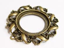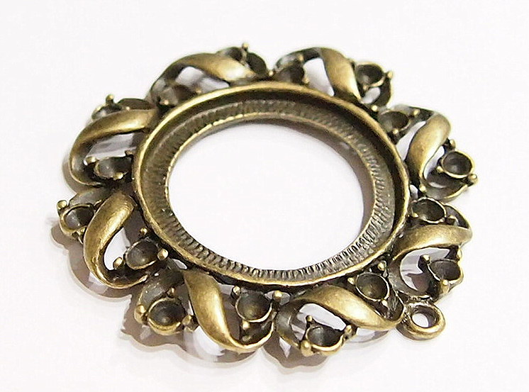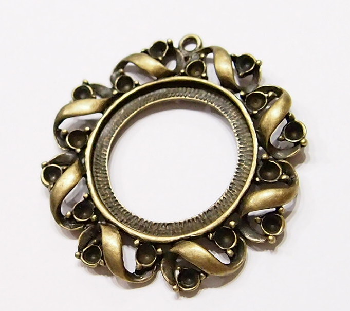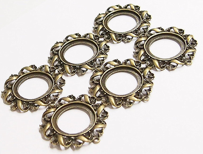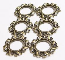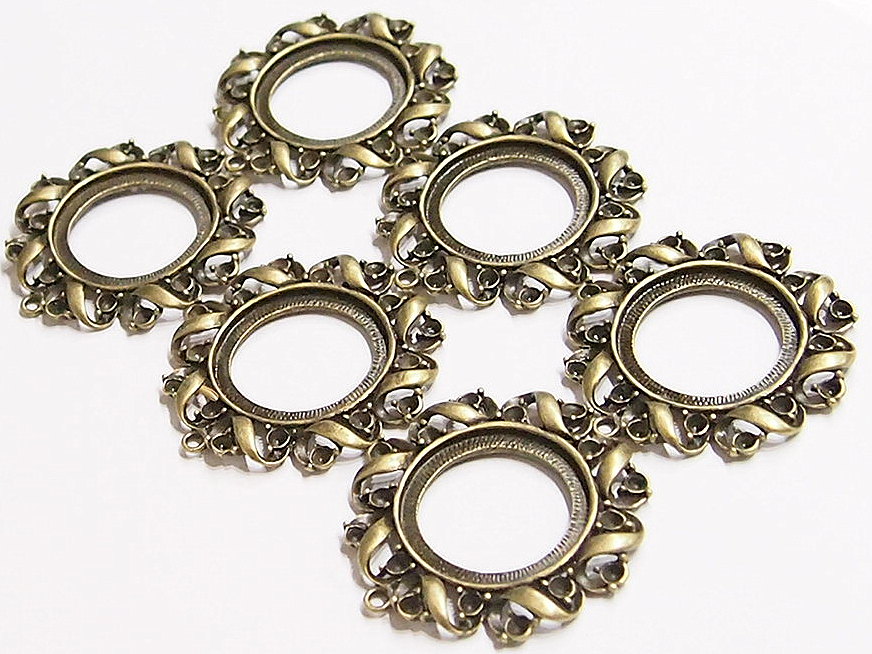 You are buying 6 of 30 mm Round Antique Gold & Brass Plated intertwined pendant settings. These pendants are really fabulous, they look like ribbon weaving and in between there are places(3 mm) for crystals or small stones to be placed, or leave them as they are these are really nice looking pendant settings without adding anything. They are also good and sturdy and have a loop at the top (2.7 mm) for your chain or jump ring (which I have 3 Colors of & 2 sizes). They are for a 30 mm Round Cameos or Cabs. No prongs so you will have to glue in whatever you are setting in these. I have lots of Great Bails, Bracelets, Cameos, Chains, Connectors, Jump Rings, Lockets, Pendants, Pins, Rings & Settings so, just look at all my listings. I have several other 30 mm Round settings in different Colors & Styles.