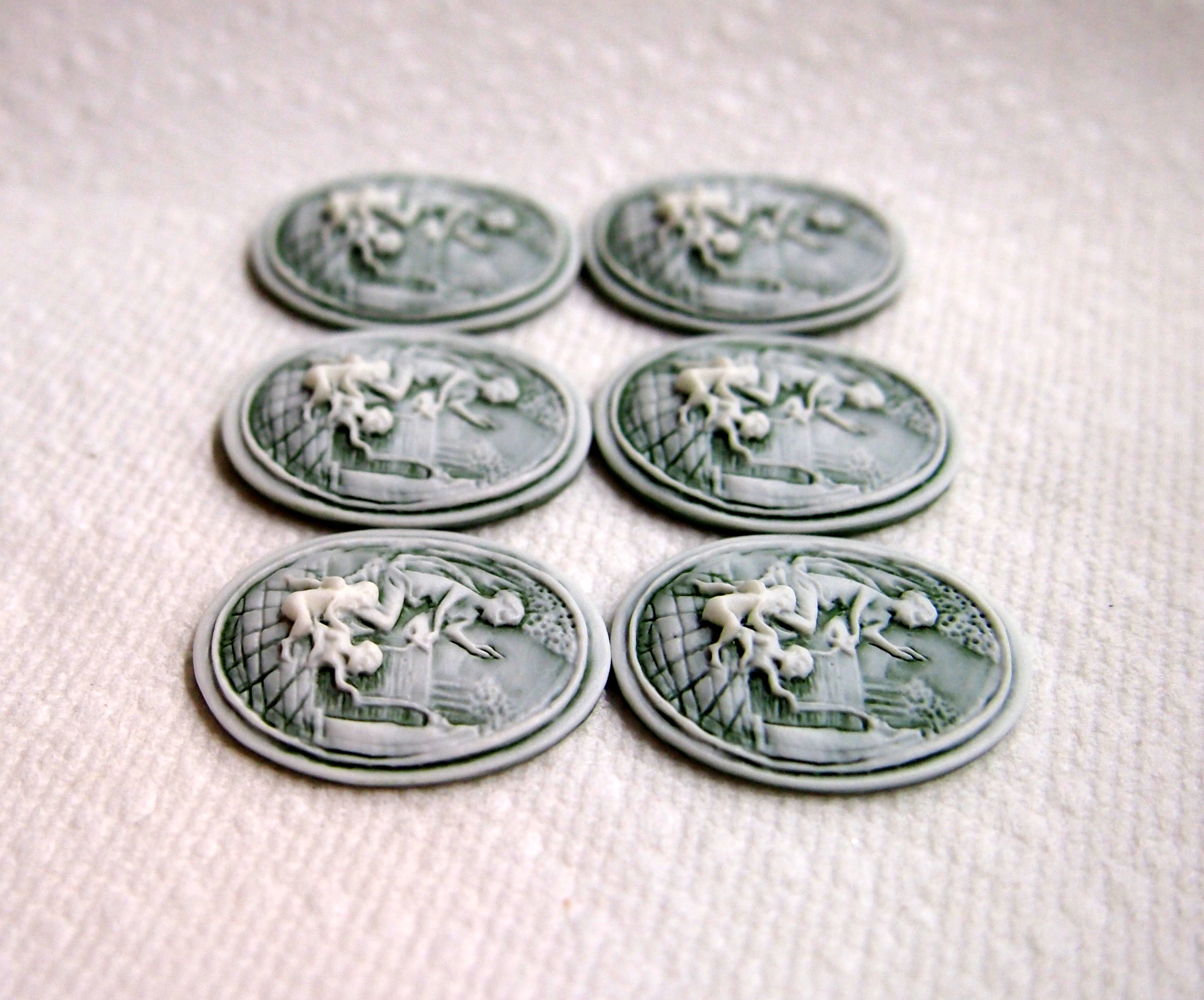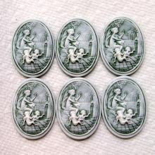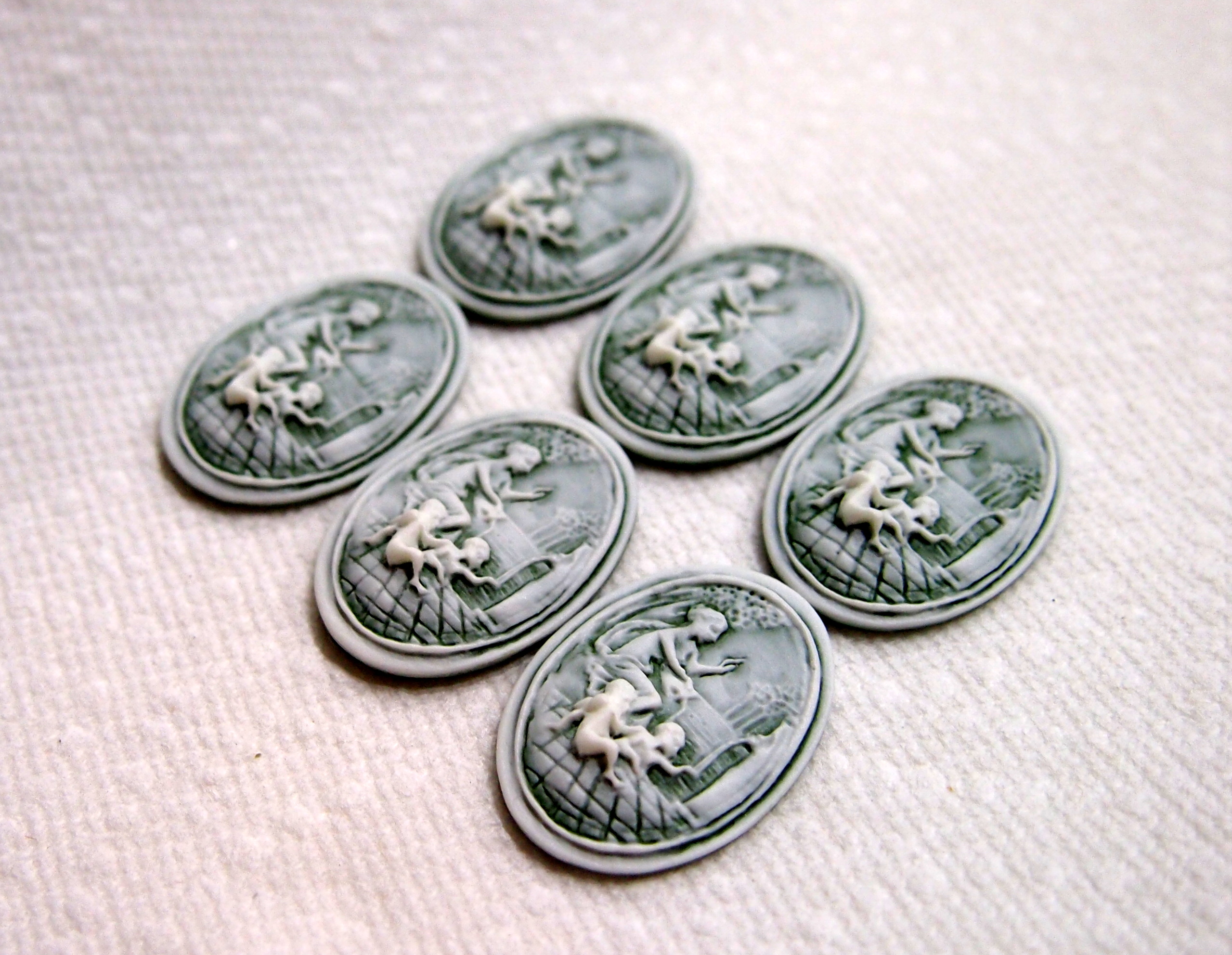 You are buying 6 Vintage Molded Resin Cameos. These are old and gorgeous, this shows a beautiful Muse with two small cherubs in front of a well as she pours water over them. I haven't seen this design in a long time. She is white that blends in the green Background. The cameos is outlined in white too. The molding process of these are just great, no flaws. I have several different settings these will fit in. They look very detailed for their size. I have lots of great cameos, settings and pendants so, just look at all my listings.