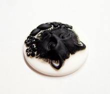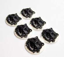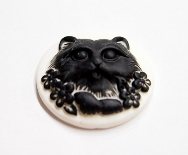 You are buying 6 of 31 mm Round Black over White Cat with Tongue Out Cameos. This cat is just gorgeous with his/her little paws in front and the tongue just out of its mouth, just precious. These are all Black with a floral pattern around her or him on a white background. They measure 31 mm round and fit into a 30 mm Round setting just perfect. The settings I have listed you can pop it into or you might have to file it down just a little bit. They look very detailed for their size. I have lots of Great Bails, Bracelets, Cameos, Chains, Connectors, Jump Rings, Lockets, Pendants, Pins, Rings & Settings so, just look at all my listings. I have these in 5 other Colors & in a group of 6 Colors as shown in the last picture.