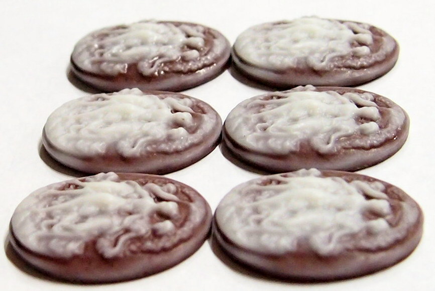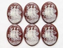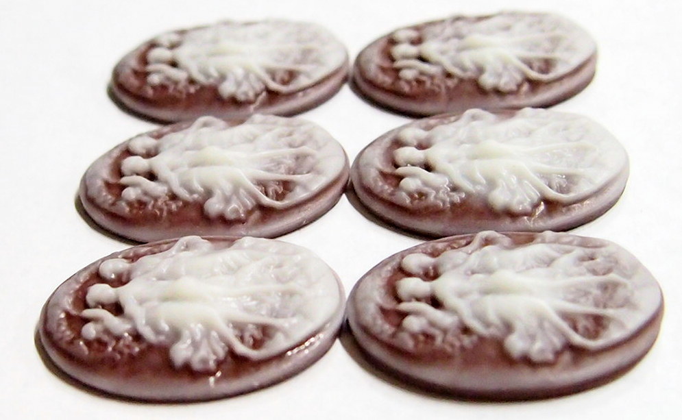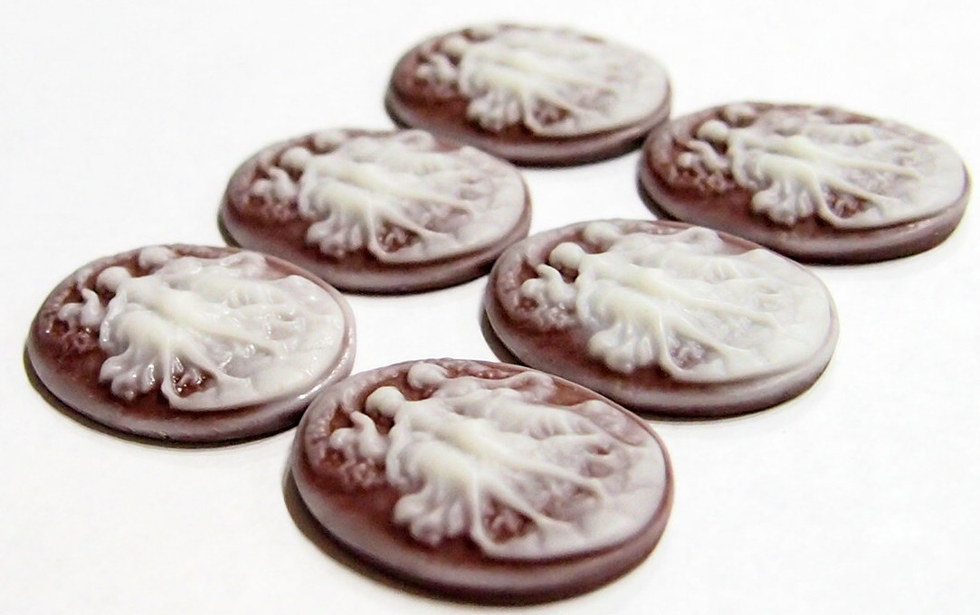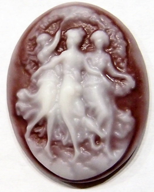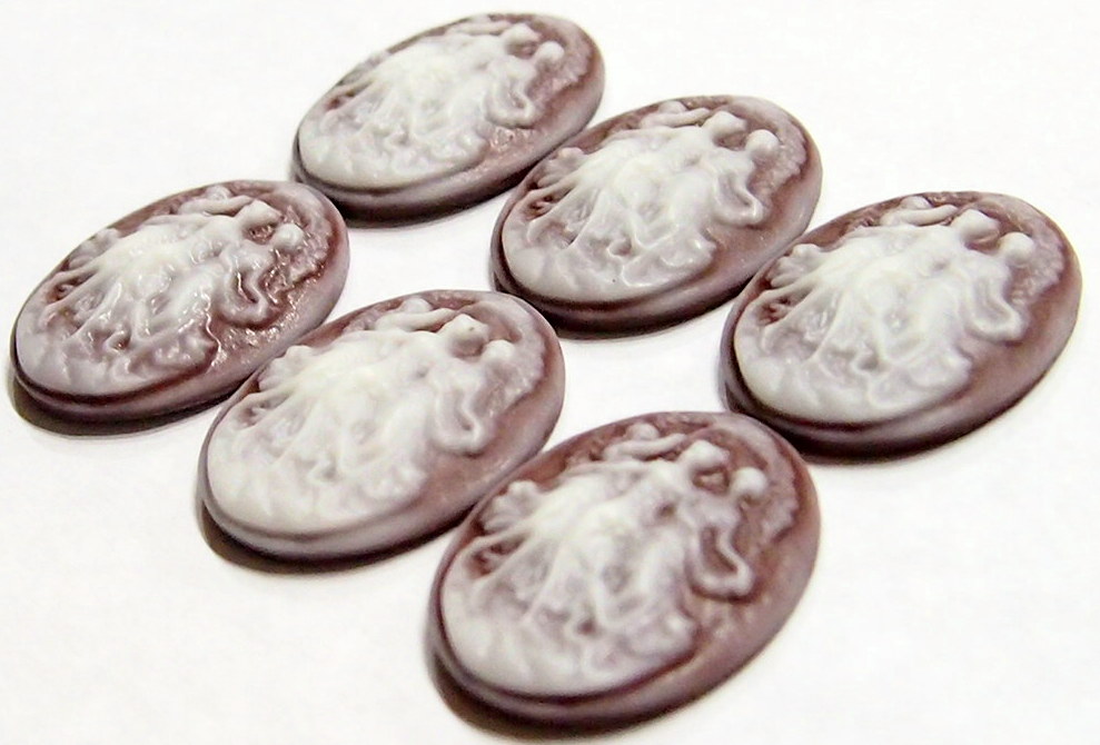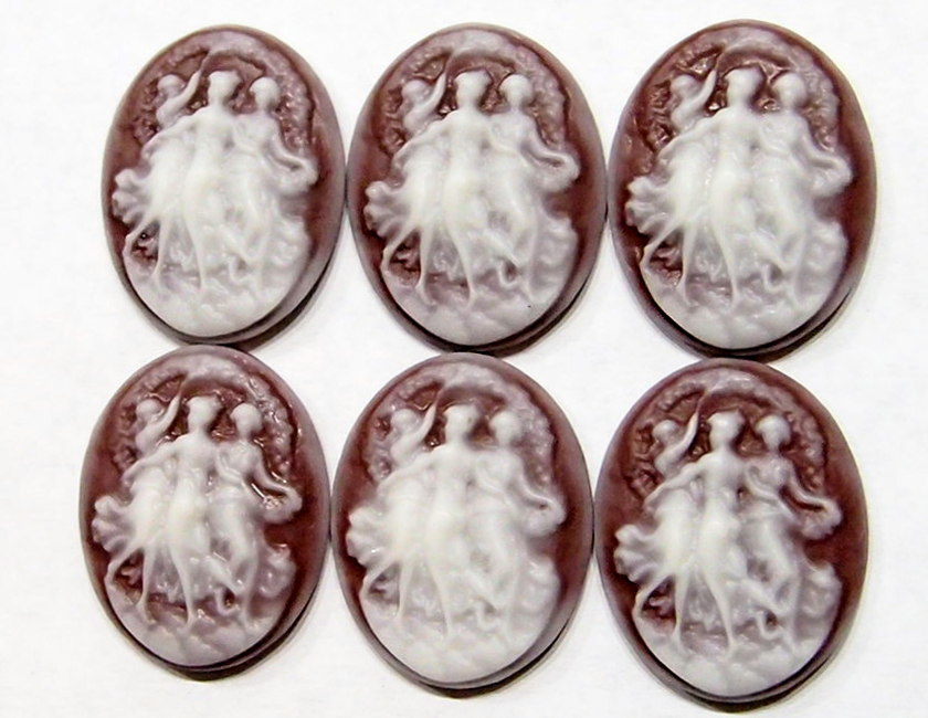 You are buying 6 of 35 mm x 28 mm White over Brown 3 Graces or Muses Dancing Cameos. These are so gorgeous, this shows a beautiful Mythology group of 3 Graces or Muses dancing. Three Graces: The Greek goddesses Euphrosyne, Aglaia, and and Thalia, representative of gentleness and refinement. The three Graces or Muses are dancing and are white on a brown background. The molding process of these are just great, no flaws. I have several different settings these will fit in. These are pretty fabulous. They measure 35 mm x 28 mm. They look very detailed for their size. I have lots of Great Bails, Bracelets, Cameos, Chains, Connectors, Jump Rings, Lockets, Pendants, Pins, Rings & Settings so, just look at all my listings. I have several Colors of these in 25x18 and 40x30 mm.