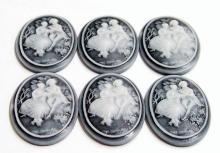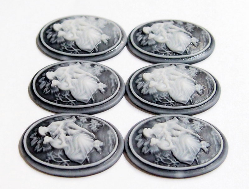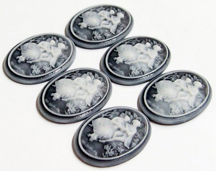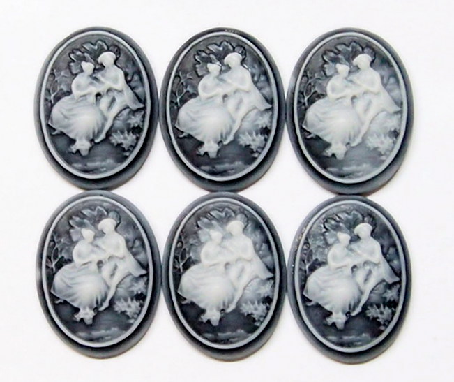 You are buying 6 of 38 mm x 28 mm Vintage Molded Resin Cameos. These are so gorgeous, this shows a beautiful Couple holding hand and romancing together, they are perfect. The couple looks like the man is proposing to his lady, they are white on a black background. (I also have this on a red background and in porcelain too.) The molding process of these are just great, no flaws. I have several different settings these will fit in. These are pretty fabulous. They measure 38 mm x 28 mm and will fit in the 40 mm x 30 mm settings I have listed. They look very detailed for their size. I have lots of Great Bails, Bracelets, Cameos, Chains, Connectors, Pendants, Pins, Rings & Settings so, just look at all my listings.