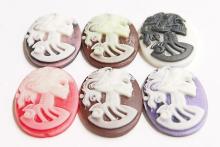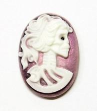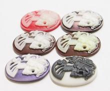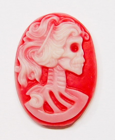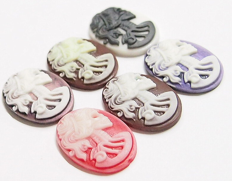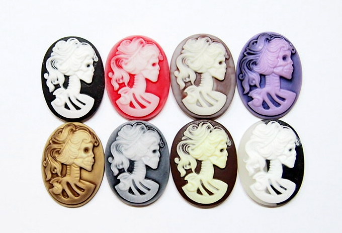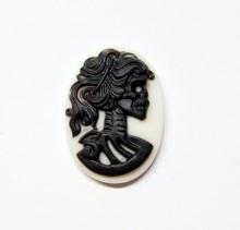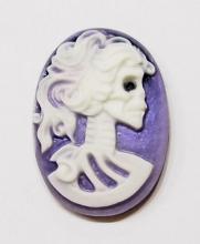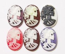 You are buying 6 different Colors of 25 mm x 18 mm Zombie Skeleton Lady Cameos, with Great Detail. They are of the Lady Skeleton Zombie Queen, I think she is strange, but cool in a way, the molding is very well done. You will receive one white over violet purple, one cream over brown, one black over white, one white over red, one white over brown, & one white over iridescent purple. These all measure 25x18 mm. They look very detailed for their size, in fact, they stand way out from the background to give them all the 3-D look. They have never been used. I have lots of Great Bails, Bracelets, Cameos, Chains, Connectors, Jump Rings, Lockets, Pendants, Pins, Rings & Settings so, just look at all my listings. All of these are offered in groups of 6 of each color. Starting on the top row left is the iridescent purple item #110911244686, the cream over brown is item #360731980581, the black over white is item #110911248582, the white over red is item #360471677865, the white over brown is item #110911248580, and the white over violet purple is item #110911244718. I also have several Colors of these in 40x30 mm and in a group of 8 different Colors item #111608549279 as shown in the last picture, sold separately.
