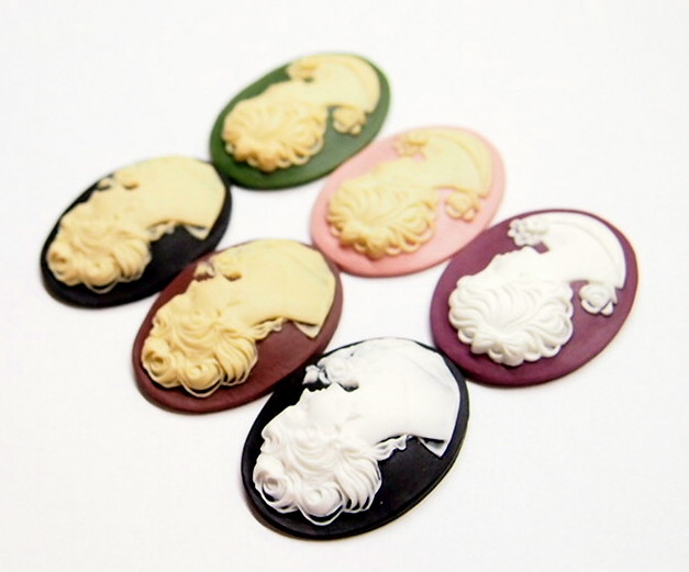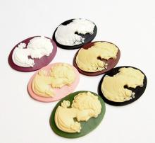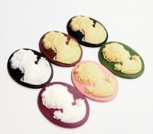 You are buying 6 Different Colors of 40 mm x 30 mm Corsage & Shy Women Cameos. These are so gorgeous, the top row shows 3 different Colors of a beautiful Victorian young woman with a Corsage. The bottom row is 3 different Colors of Women in a Shy Pose with a Corsage & her hair up. Exactly what you see is what you will receive. These all measure 40 mm x 30 mm. The three on the top are different than the three on the bottom. The molding process of these are just great, no flaws. I have several different settings these will fit in. These are pretty fabulous. They look very detailed for their size. I have lots of Great Bails, Bracelets, Cameos, Chains, Connectors, Jump Rings, Lockets, Pendants, Pins, Rings & Settings so, just look at all my listings. All of these are offered in groups of 4 of each Color. Starting with the top row left to right is the white over black item #361221005331, cream over brown is item #110911255145, cream over black is item #110926215972, bottom row white over plum item #110911244728, cream over pink item #360471677832, and the cream over green is item #110911248586. The bottom row of 3 is offered in a group of 3 item #110930805572 as shown in the next to last picture, sold separately. I have several like these in 25x18 mm like the group of 10 different Colors as shown in the last picture item #360935670102, sold separately.