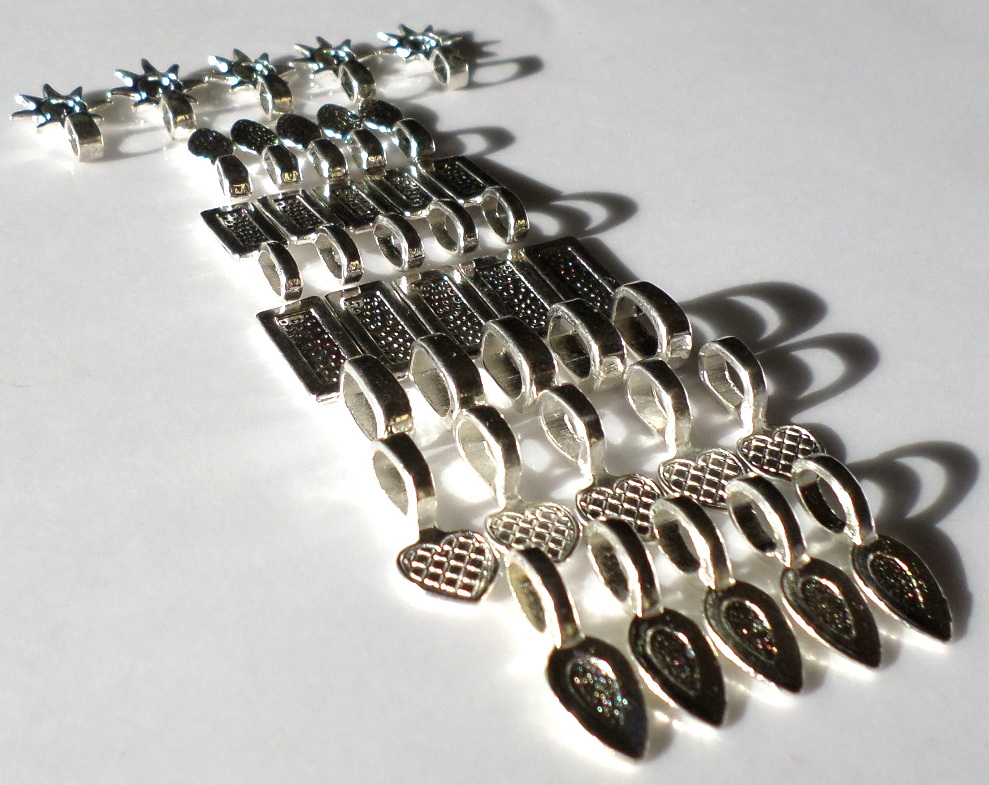 You are buying 30 shiny silver plated glue on bails in 6 different versatile styles and sizes. You can glue large to small items with these type of bails. These are exactly what you need to make anything into a pendant, either cameos, cabochons, glass or tiles. Starting from the top to bottom. The shiny silver plated spoon shaped have a big glue area and measure 21 mm long x 7.5 mm wide item #360545800231. The heart shaped shiny silver plated glue bails measure 19 mm long x 9.7 mm wide item # 360471675620. The large shiny silver plated rectangle glue on bails measure 26 mm long x 7.7 mm wide with a nice big loop (8 x 5 mm) item #360471676542. The medium shiny silver plated rectangle glue on bails measure 21 mm long x 6.8 mm wide with a nice size loop (7 mm x 4 mm) item #360471675909. The small silver plated oval shaped glue on bails measure 15 mm long x 5 mm wide with a nice loop that is 4.2 mm x 2.2 mm item #110951837780. The sun & moon shaped silver plated medium glue on bails measure 17 mm long x 12 mm wide & the loop is 4 mm x 3 mm item #360471676487. All of these will help you start or finish any project you have. I have lots of Great Bails, Bracelets, Cameos, Chains, Connectors, Jump Rings, Lockets, Pendants, Pins, Rings & Settings so, just look at all my listings. The heart shaped bails are also offered in a group of 20 with 4 different colors item #111005678705 as shown in the sixth from last picture. The large rectangle shaped bails are also offered in a group of 20 with 4 different colors item #111362727766, as shown in the fifth from last picture, sold separately. The medium rectangle shaped bails are also offered in a group of 20 with 4 different colors item #111865437685, as shown in the fourth from last picture, sold separately. The small oval shaped bails are also offered in a group of 20 with 4 different colors item #360471676539, as shown in the third from last picture, sold separately. The sun and moon shaped bails are also offered in a group of 20 with 4 different colors item #361461640151, as shown in the second from last picture, sold separately. Also offered is a group of 21 Different Glue Bails, in 6 Styles & 4 Colors, as shown in the last picture item #110911244722, sold separately.