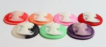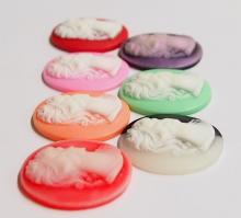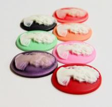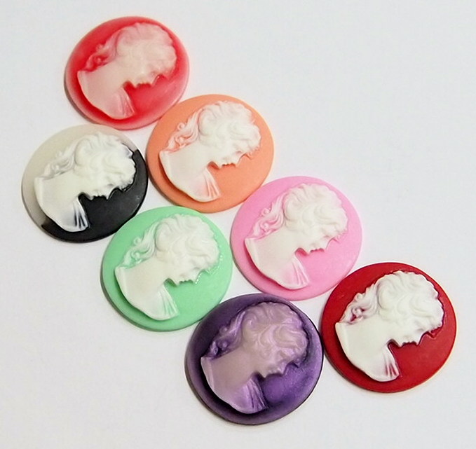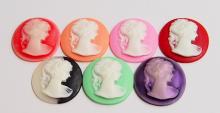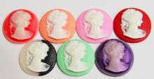 You are buying 7 different Colors of 30 mm Round Classic Lady with Ponytail Cameos. They are very detailed and very 3-D looking, as she is sticking away from the background. The molding process of these are just great, no flaws. I have several different settings these will fit in. They look very detailed for their size. I have lots of Great Bails, Bracelets, Cameos, Chains, Connectors, Jump Rings, Lockets, Pendants, Pins, Rings & Settings so, just look at all my listings. All of these are offered in groups of 6 of each color. Starting on the top row left to right is the white over red item #316449927079, white over peach item #110930805535, white over pink item #519391919784, white over dark red item #360471675914, bottom row is white over gray & black item #110911242493, white over green item #110930805587, and the white over purple is item #360471675997. I have several styles and colors of 30 mm round settings these fit into just fine so give them a look.