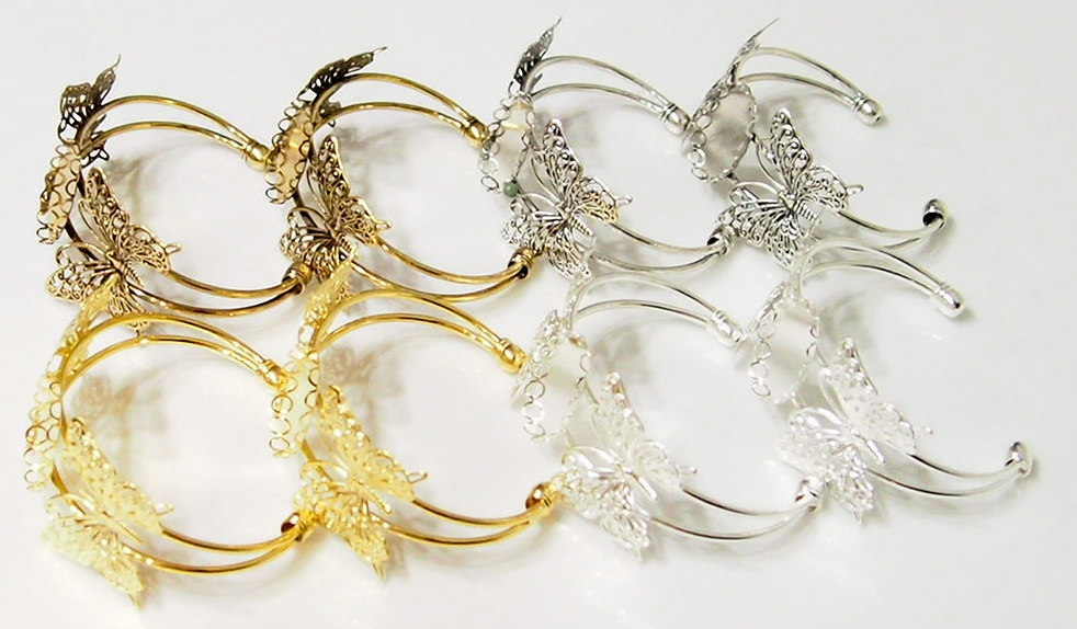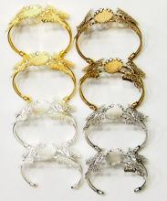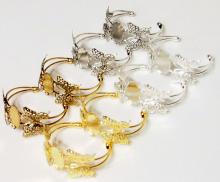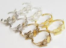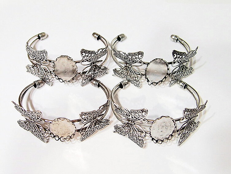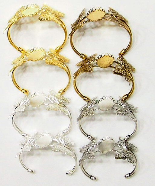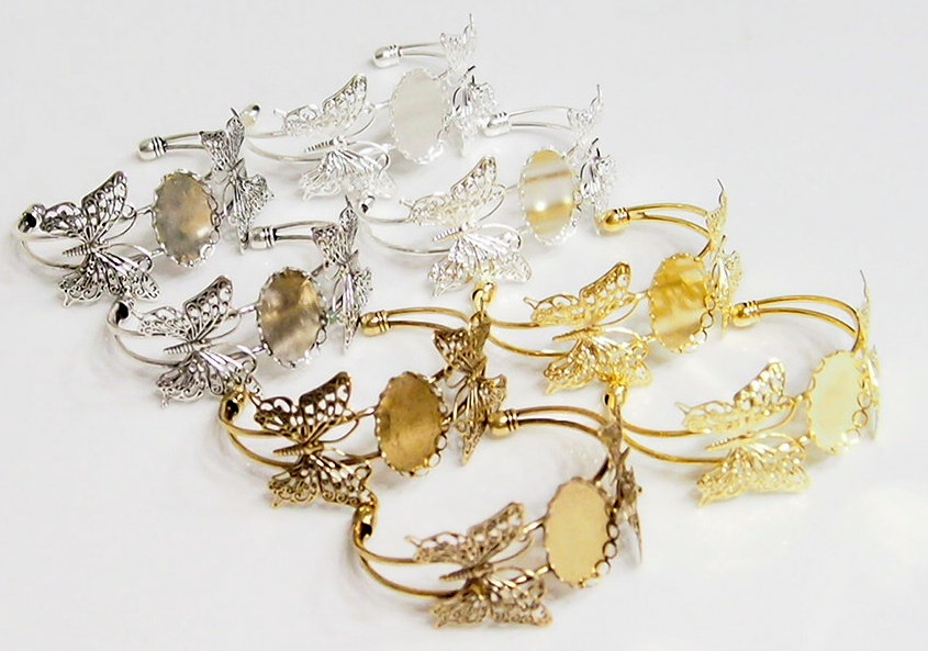 You are buying 8 of 25 mm x 18 mm Bracelet Settings, you can use these for Cameos or Cabs. You will receive two each Antique Gold, Gold, Antique Silver & Silver, these are all Plated. These are vintage reproductions and are brand new. These are cuff bracelets in four Colors. These are very sturdy and cameos or cabs will have to be glued in. I am selling these in lots of 8 to ship in a small priority box instead of a padded envelope for protection. The Butterflies are sturdy, but I will not chance something really heavy crushing these(you never really know what can happen with your package with USPS) well made bracelets. I can fit 2 sets of these in a flat rate box. These would make anything look classy. The biggest size that will fit in these are 25 mm x 18 mm. Since they are a solid back, you could go down in size a little if you had an odd size cameo or cab to try & fit. I have lots of Great Bails, Bracelets, Cameos, Chains, Connectors, Jump Rings, Lockets, Pendants, Pins, Rings & Settings so, just look at all my listings. All of these are offered in groups of 4 of each color. The antique gold is item #112446754600, gold is item #360471679686, antique silver is item # 110930805429, and the silver is item # 360478420801. These are also offered in a group of 4 with one each of the 4 colors as shown in the last picture item #110911242469. I have many other styles/sizes & Colors of Bracelets.