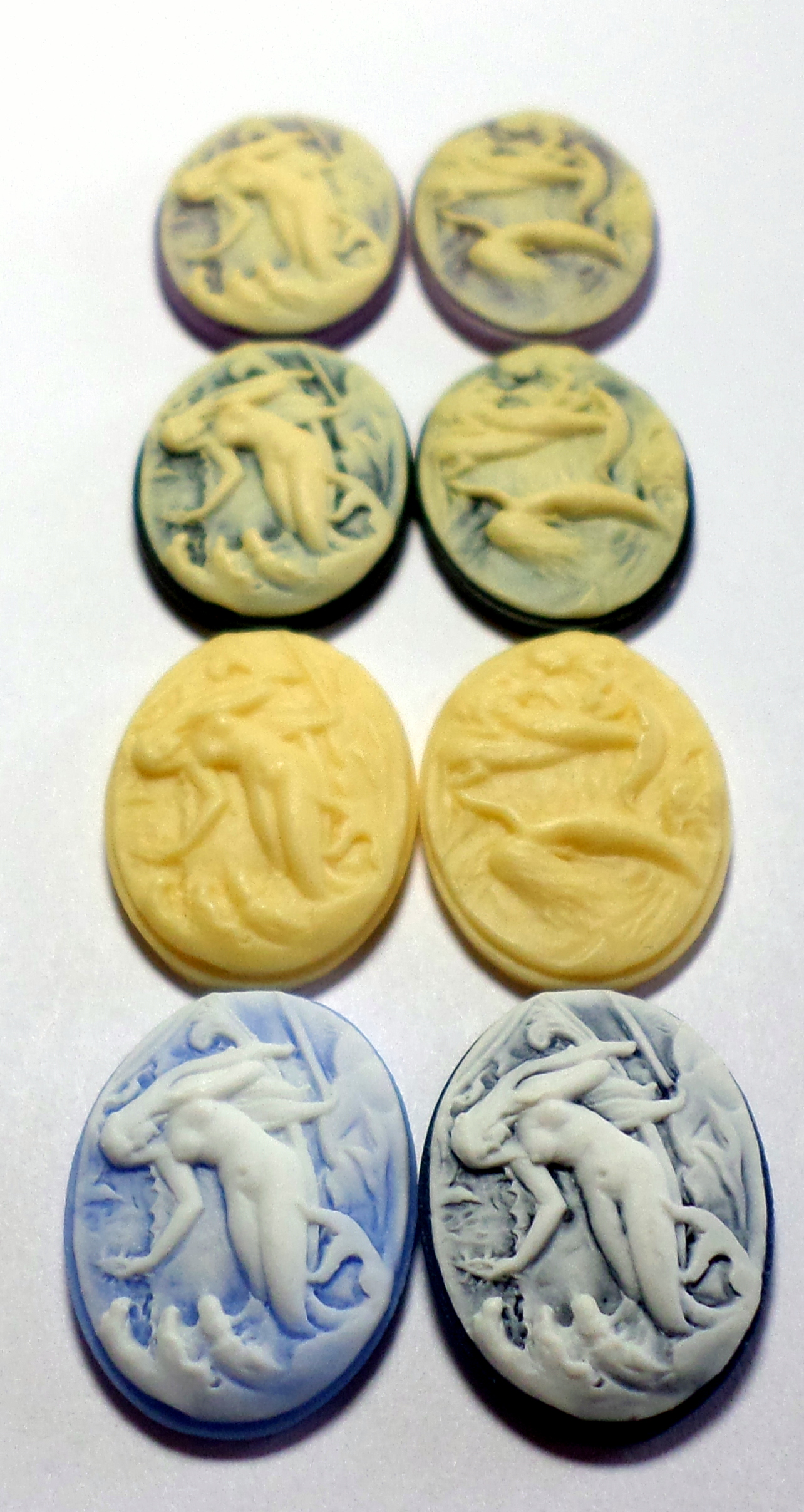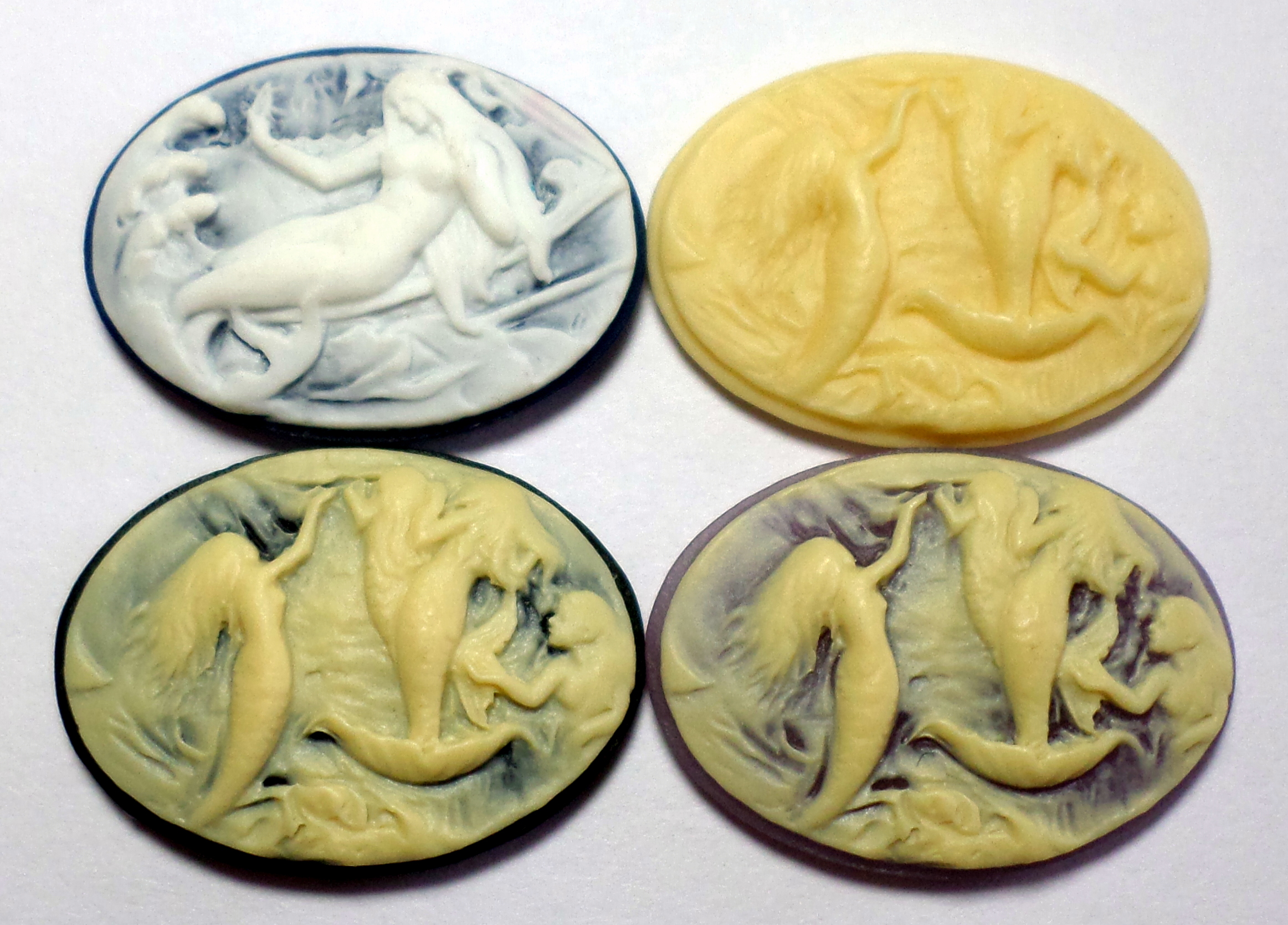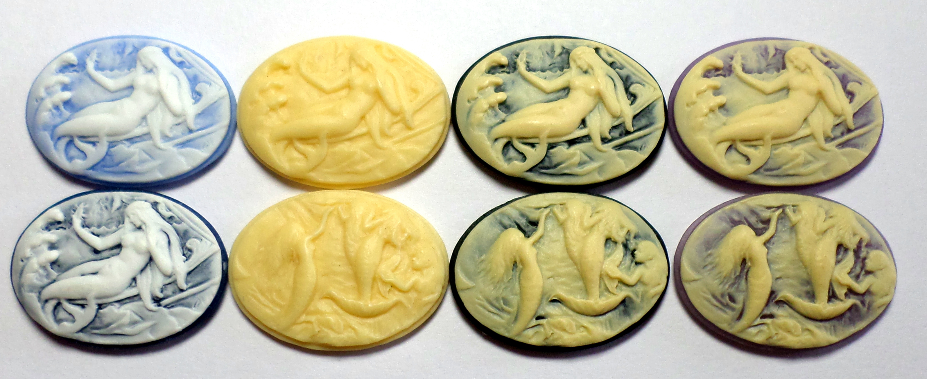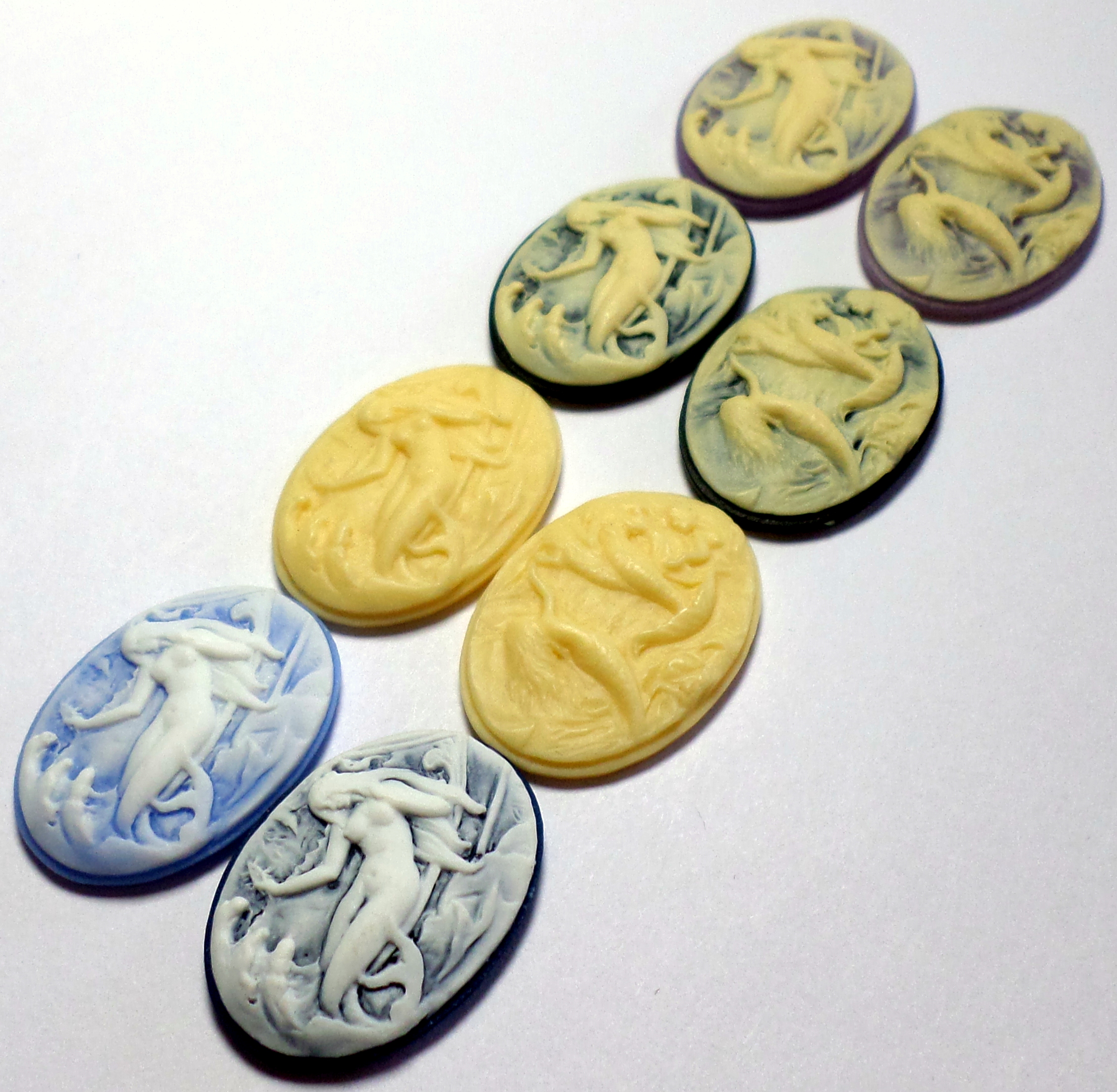 You are buying 8 of 25 mm x 18 mm Horizontal Single & Five Mermaid Resin Cameos. This is a group of 5 Colors of a single gorgeous full length Mermaid sunning on the rocks and 3 of five gorgeous mermaids also sunning on the rocks. The molding process of these are just great, no flaws. These all measure 25 mm x 18 mm and are horizontal in orientation. These are all listed in groups of 6 of each color. The single white over sky blue mermaid is item #112364670176. The single cream over cream is item #360471676503. The cream over black single is item #110911243414. The cream over purple single mermaid is item #110963582957. On the bottom row starting left to right is the white over dark blue single mermaid item #110911242496. Next is the cream over cream five mermaids item #110911244743. The cream over black 5 mermaids is item #110981672178. And the cream over purple five mermaids is item #110981679352. I have several different settings and bracelets these will fit in. They all look very detailed for their size. I have lots of Great Bails, Bracelets, Cameos, Chains, Connectors, Jump Rings, Lockets, Pendants, Pins, Rings & Settings so, just look at all my listings. I also offer these mermaids cameos in 40x30 mm.