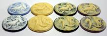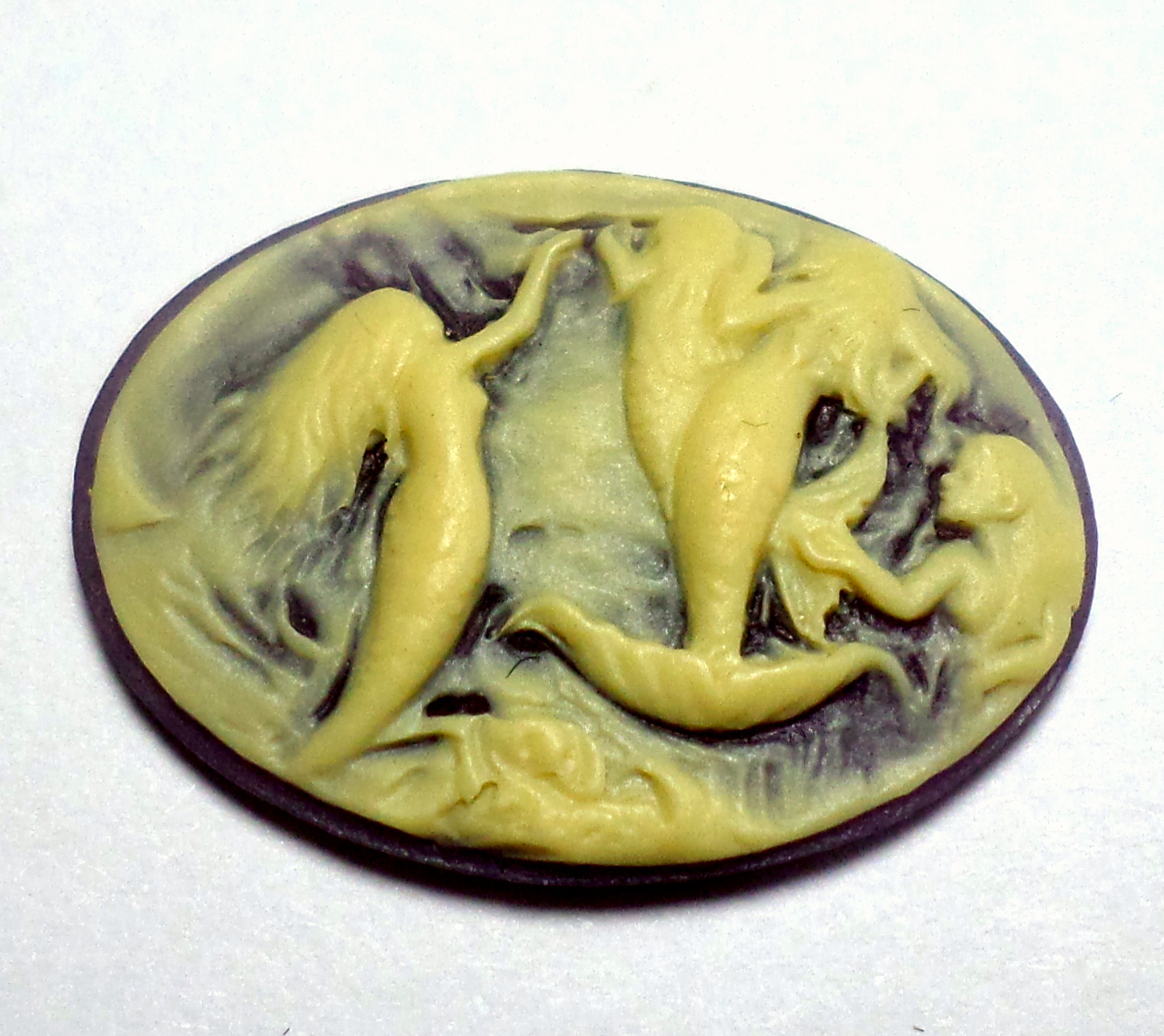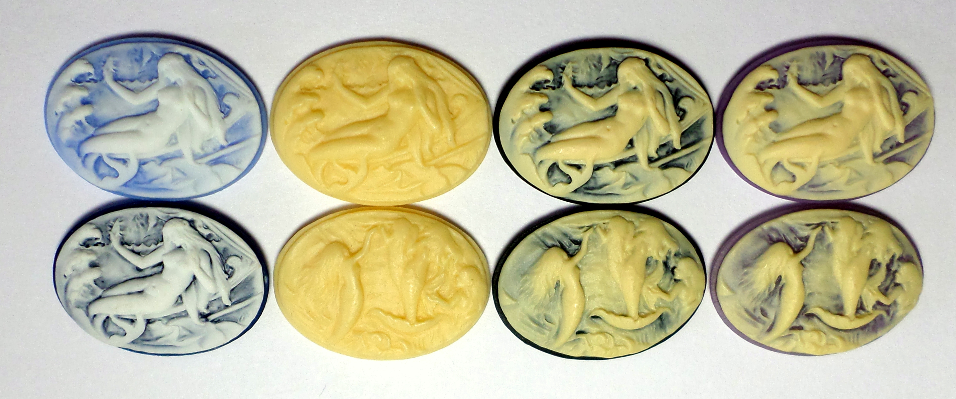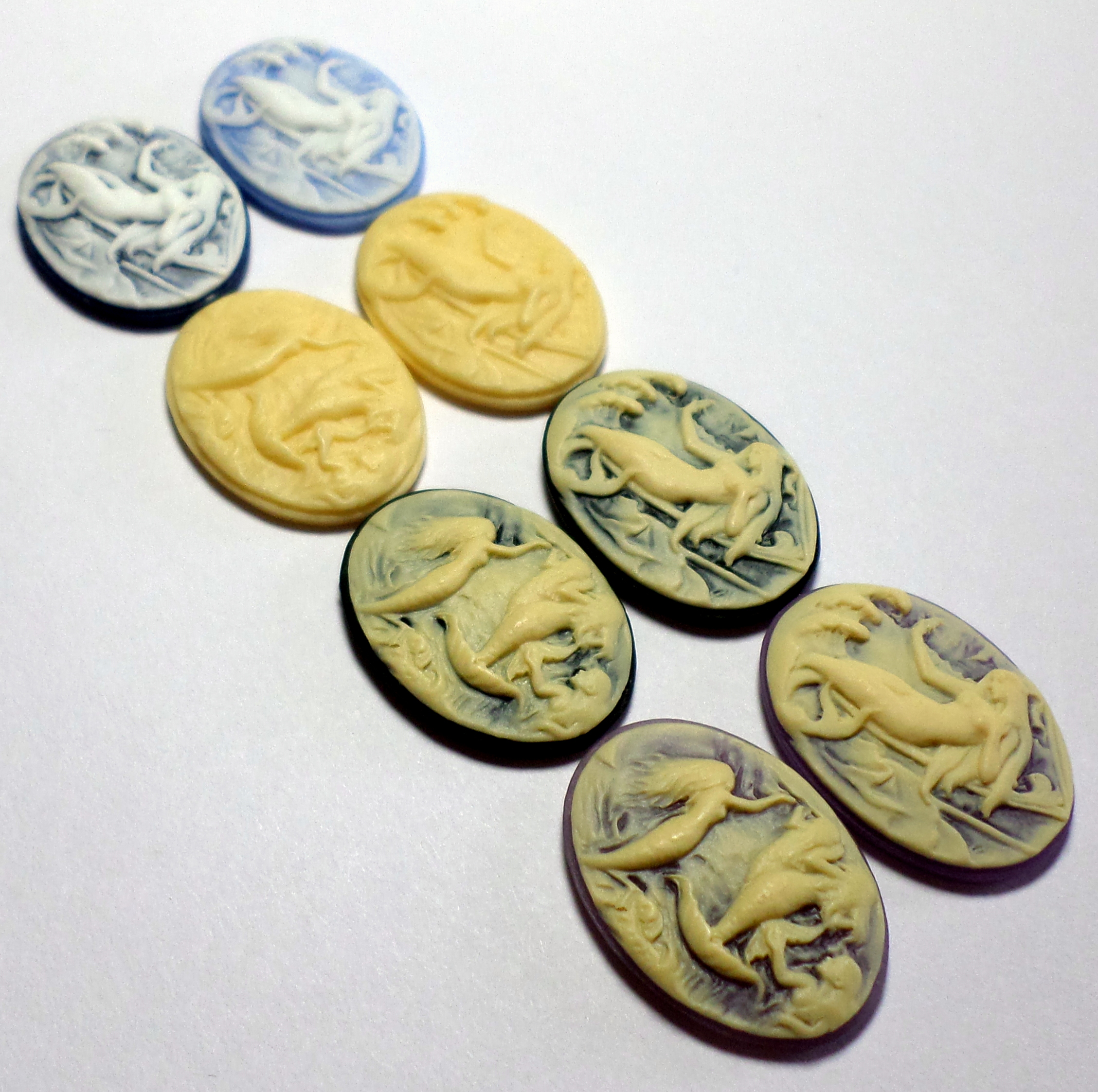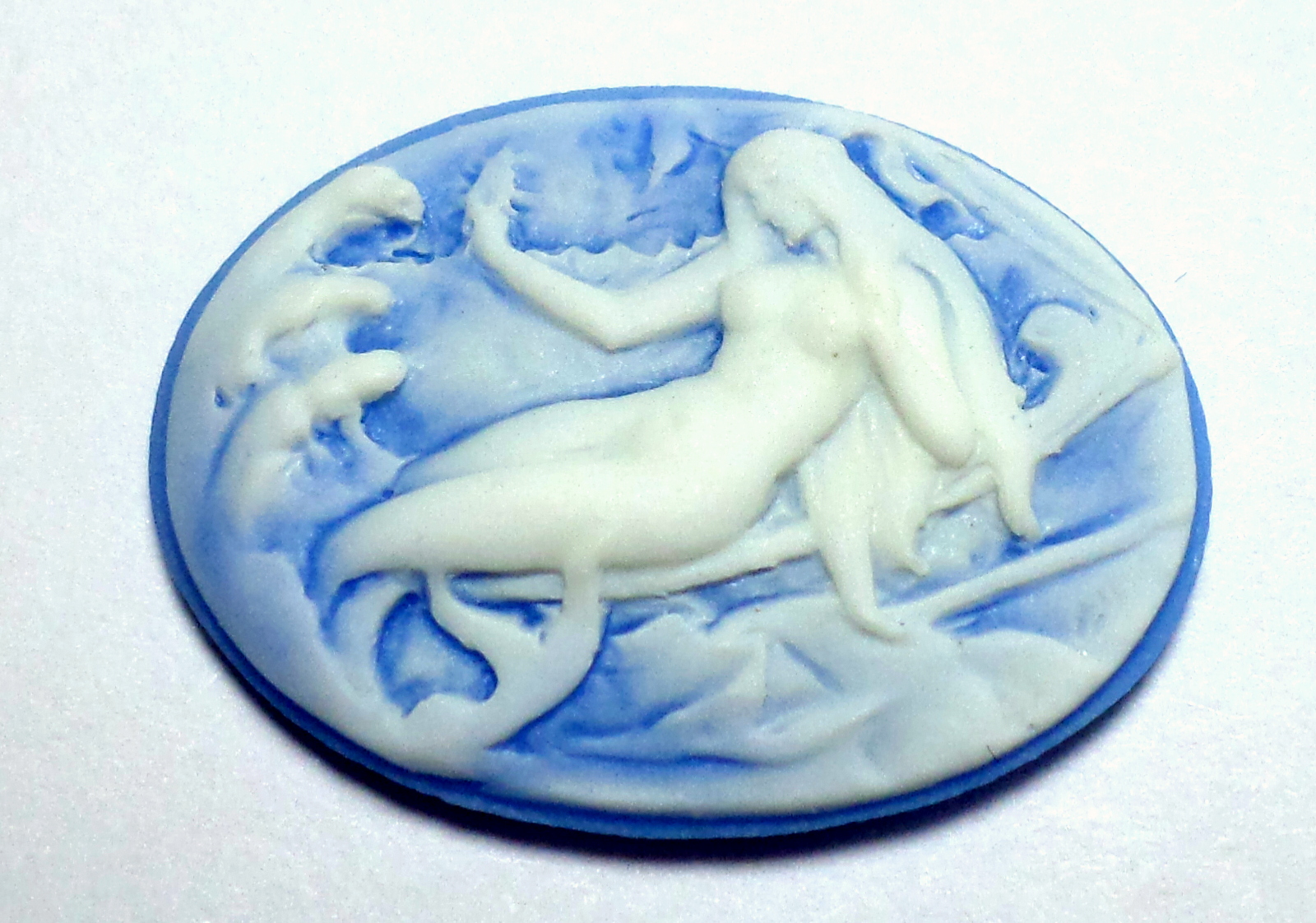 You are buying 8 of 25 mm x 18 mm Horizontal Single & Five Mermaid Resin Cameos. This is a group of 5 Colors of a single gorgeous full length Mermaid sunning on the rocks and 3 of five gorgeous mermaids also sunning on the rocks. The molding process of these are just great, no flaws. These all measure 25 mm x 18 mm and are horizontal in orientation. These are all listed in groups of 6 of each color. The single white over sky blue mermaid is item #112364670176. The single cream over cream is item #360471676503. The cream over black single is item #110911243414. The cream over purple single mermaid is item #110963582957. On the bottom row starting left to right is the white over dark blue single mermaid item #110911242496. Next is the cream over cream five mermaids item #110911244743. The cream over black 5 mermaids is item #110981672178. And the cream over purple five mermaids is item #110981679352. I have several different settings and bracelets these will fit in. They all look very detailed for their size. I have lots of Great Bails, Bracelets, Cameos, Chains, Connectors, Jump Rings, Lockets, Pendants, Pins, Rings & Settings so, just look at all my listings. I also offer these mermaids cameos in 40x30 mm.