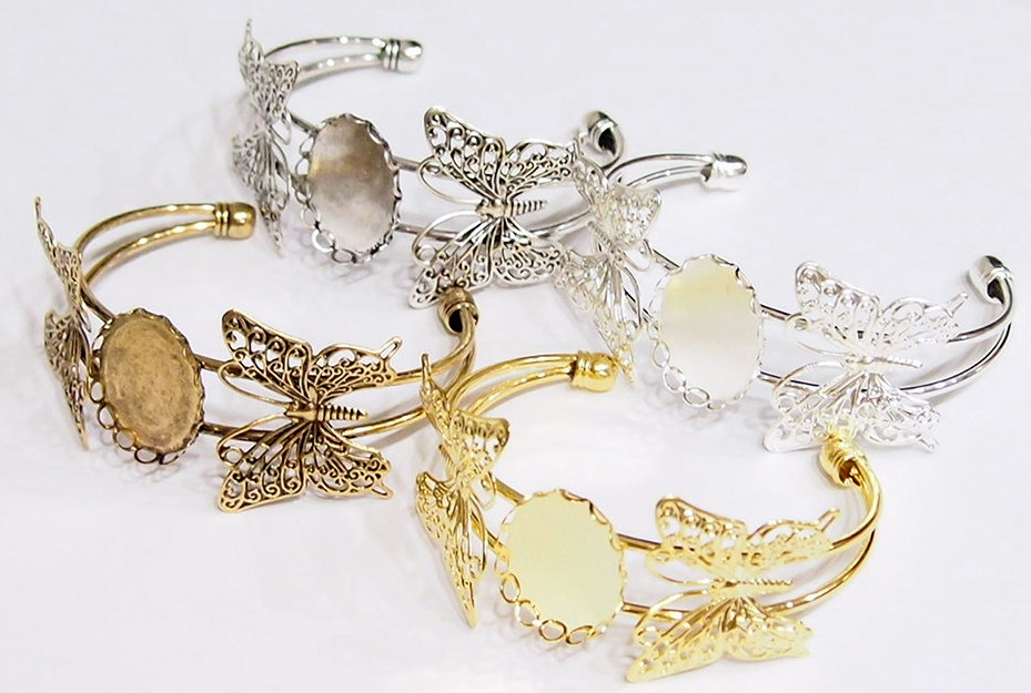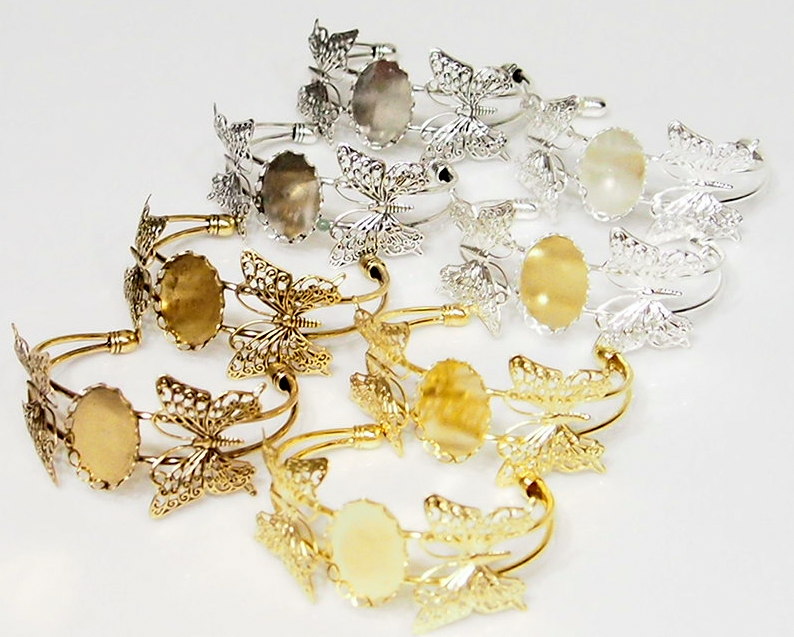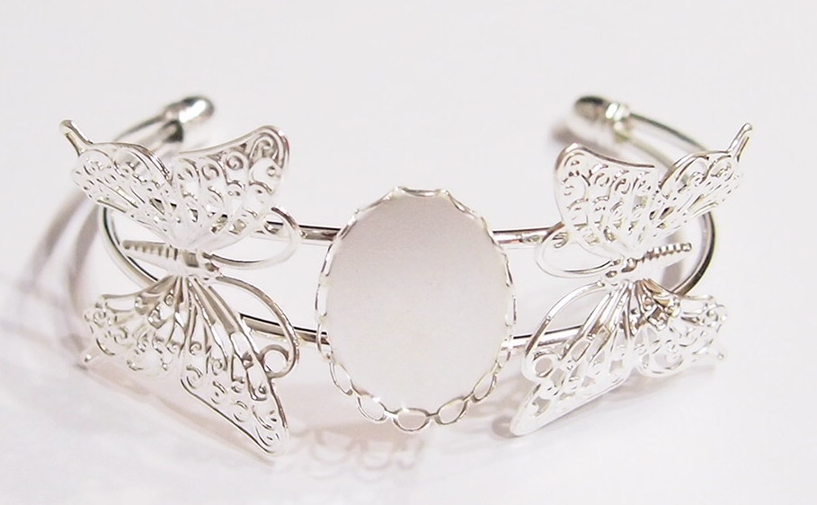 You are buying 8 of 25 mm x 18 mm Silver Plated Butterflies Cuff Bracelet Settings, you can use these for Cameos or Cabs. You will not be disappointed in the quality, it is excellent and if I was setting any cameos or cabs, I would use these. These are vintage reproductions and are brand new. These are very sturdy and cameos or cabs will have to be glued in. These would make anything look classy. The biggest size that will fit in these are 25 mm x 18 mm. Since they have a solid back, you can go down on the size some if you had an odd size cameo or cab to try & fit. I have lots of Great Bails, Bracelets, Cameos, Chains, Connectors, Jump Rings, Lockets, Pendants, Pins, Rings & Settings so, just look at all my listings. I have these in 3 other Colors & in a group of 4 Colors as shown in the next to last picture item #110911242469 and are sold seperatly. These are also offered in a group of 2 of each of 4 different Colors (Antique Gold, Gold, Antique Silver, and Silver), for a total of 8 Gorgeous Butterfly Cuff Bracelet Settings as shown in the last picture item #360760726827 and are also sold seperatly.