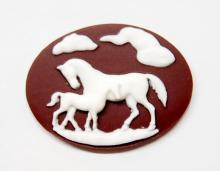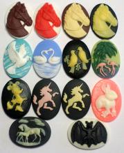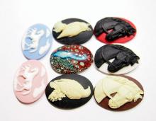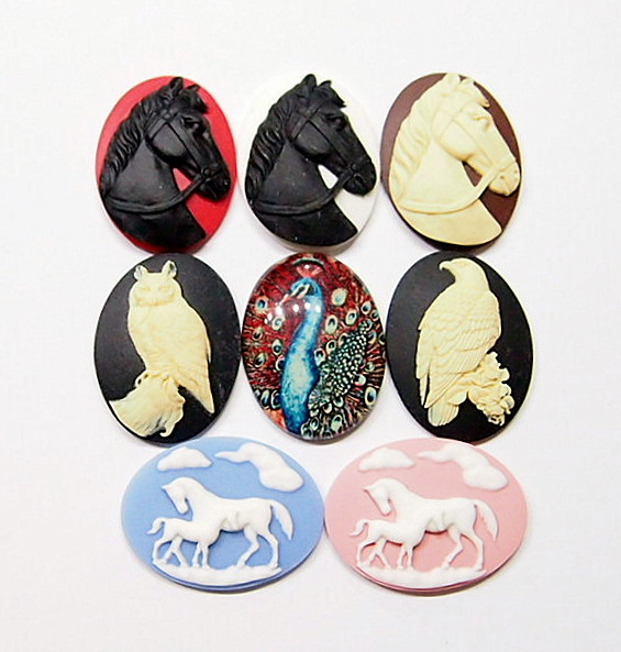 You are buying 8 Different Colors of 40 mm x 30 mm Animal Cameos. These are so gorgeous, Horses on the top row in three Color schemes followed by a Great Horned Owl, then a transferware Peacock, and the American Eagle on the second row. The bottom row has two Colors of Horizontal in orientation Mare & Colt, or two Horses standing in the grass with clouds in the sky. Exactly what you see is what you will receive. These are all very detailed and all my cameos have never been used. The molding process of these are just great, no flaws.These are all pretty fabulous. These all measure 40 mm x 30 mm. I have lots of Great Bails, Bracelets, Cameos, Chains, Connectors, Jump Rings, Lockets, Pendants, Pins, Rings & Settings so, just look at all my listings. All of these are offered in groups of 4 of each color. Starting with the top row left to right the black over red background horse portrait is item #110963564843, the black over white is item #111938079144, cream over brown is item #360478420824, the cream over black majestic owl is item #360644919805, the acrylic peacock is item #360725443783, the cream over black american bald eagle is item #360644925809, the horizontal white over blue background 2 horses is item #361948434683, and the white over pink is item #110911248656. I also offer 2 more colors of the horizontal 2 horses. The white over brown is item #111934150223, and the cream over black is item #111956853445, as shown in the fourth and third from last pictures. I also offer a group of all horse cameos in 40x30 mm (4 vertical & 4 horizontal) as shown in the next to last picture item #360471676540, sold separately. I also have a group of 14 different 25x18 mm Cameos as shown in the last picture item #112374318803, sold separately, with horses, birds, flamingos, Minnie mouse, unicorns, a bunny rabbit and a bat.