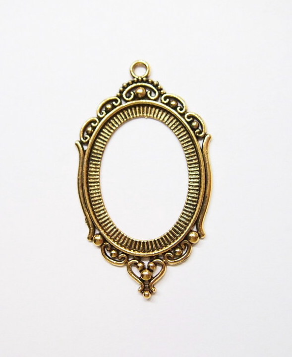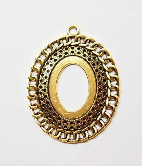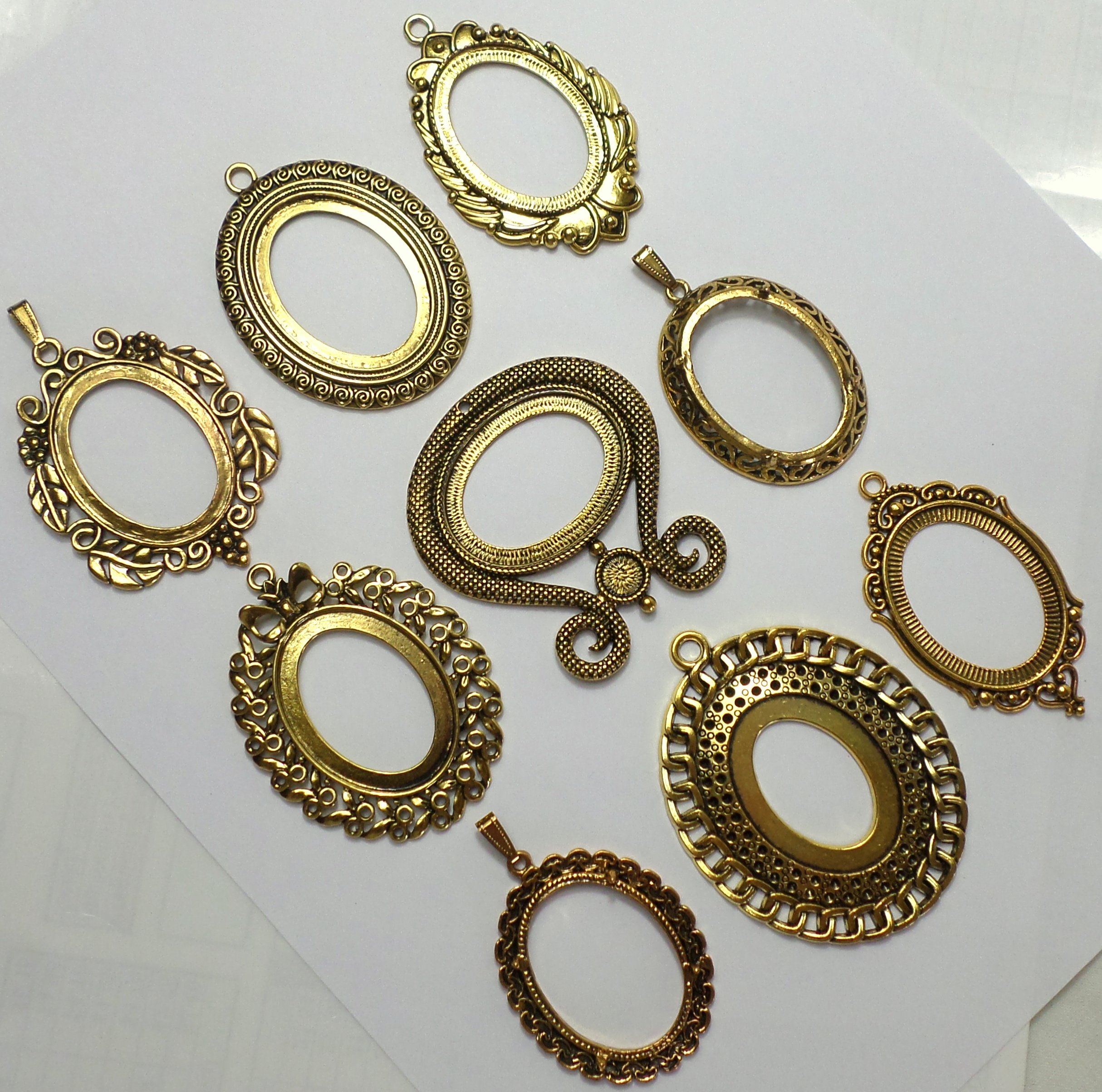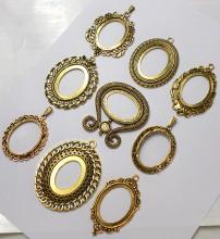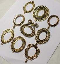 You are buying 9 Different 40 mm x 30 mm Antique Gold Plated Sturdy Pendant Settings. All of these settings were originally from some old 1900-1930's molds, I found a company to make these for me and they are gorgeous. These all have a loop at the top for your Chain/Cord or Jump Ring (which I have 3 Colors & 2 Sizes of). The center one which is a Horizontal setting can be used in 2 different orientations. You will not be disappointed in the quality, it is excellent and if I was setting any cameos or cabochons, I would use these. These will work great for any cameos or cabochons, they will have to be glued in. I have lots of Great Bails, Bracelets, Cameos, Chains, Connectors, Jump Rings, Lockets, Pendants, Pins, Rings & Settings so, just look at all my listings. All of these are offered in groups of 4 of this Color. Starting with the top row left to right is the 40x30 antique gold grapes and leaf setting item #360481657888, the Victorian Scroll is item #111722043230, next is the laurel wreath item #111721928192, next row down is the bows item #360478420751, next is the horizontal checkered item #360805242371, next is the old Victorian flower style thick prong setting item #110938126554, next row down is the old Victorian flower style prong item #110938129888, next is the linked chain item #360894451487, and the third from last picture is the 40x30 mm antique gold beaded and scalloped setting item #111862333959. The next to last picture shows the backside of them all. I also have this same group in antique silver item #362147043128, as shown in the last picture, sold separately.