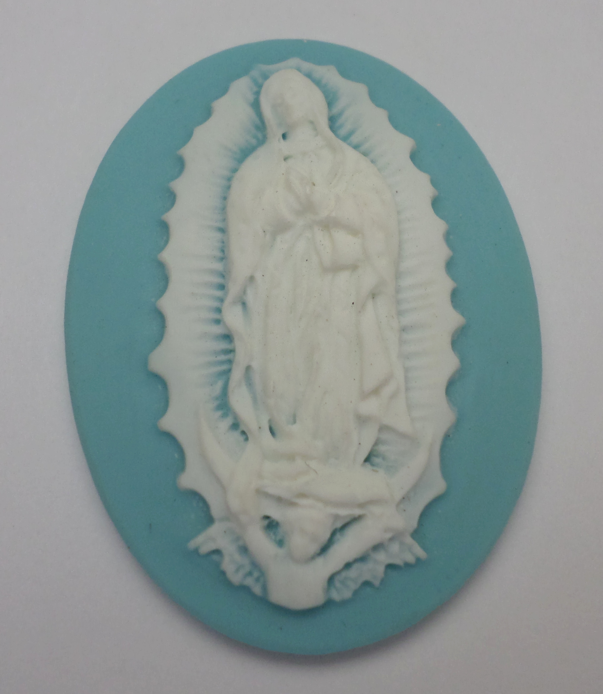 You are buying 9 Different Colors of 40 mm x 30 mm Lady of Guadalupe Cameos. These are all of the Lady of Guadalupe, these are molded. These stand out from the cameo to give them all the 3-d effect. What you see is what you will receive. They all look very detailed for their size. I have lots of Great Bails, Bracelets, Cameos, Chains, Connectors, Jump Rings, Lockets, Pendants, Pins, Rings & Settings so, just look at all my listings. Starting with the top row left to right is the white over baby blue, white over brown, white over tan. 2nd row white over pink, white over dark blue, white over purple. Bottom row is white over over turquoise, white over light brown, and cream over black. These are all gorgeous. The last picture shows the backside of them all. I have several others like these so give them all a look.