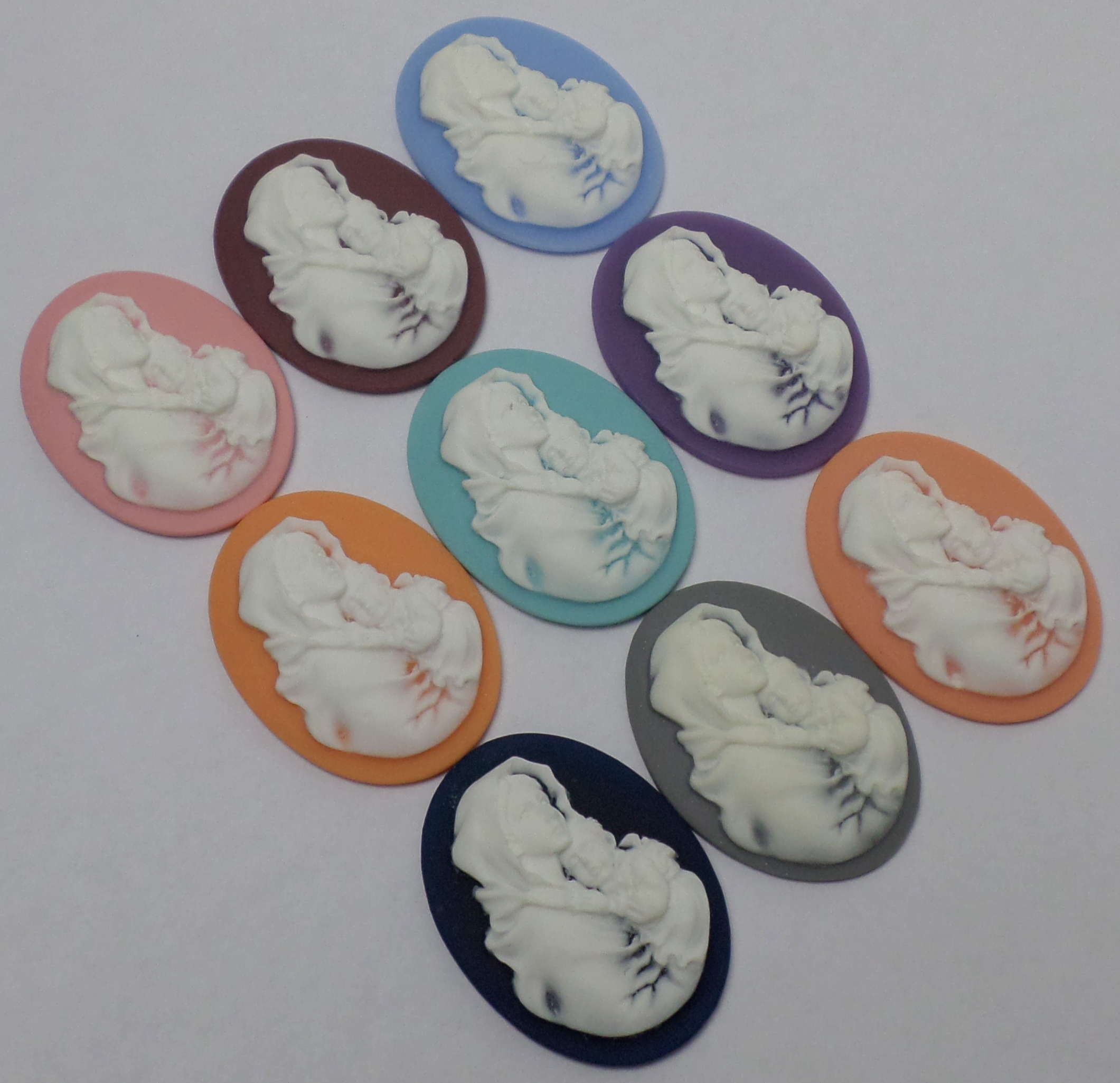 You are buying 9 Different Colors of 40 mm x 30 mm Mary Cradling Baby Jesus Cameos. These are all of the Beautiful Mary with baby Jesus, held tight to her shoulder, these are molded. These stand out from the cameo to give them all the 3-d effect. What you see is what you will receive. Starting with the top row left to right is the white over pink, white over brown, white over baby blue. 2nd row white over tan/brown, white over turquoise, white over purple. Bottom row white over dark blue, white over blue/grey, white over light brown. These are simply gorgeous and show Mary cradling her Jesus. They look very detailed for their size. I have lots of Great Bails, Bracelets, Cameos, Chains, Connectors, Jump Rings, Lockets, Pendants, Pins, Rings & Settings so, just look at all my listings. The last picture shows the backside of them all.