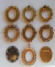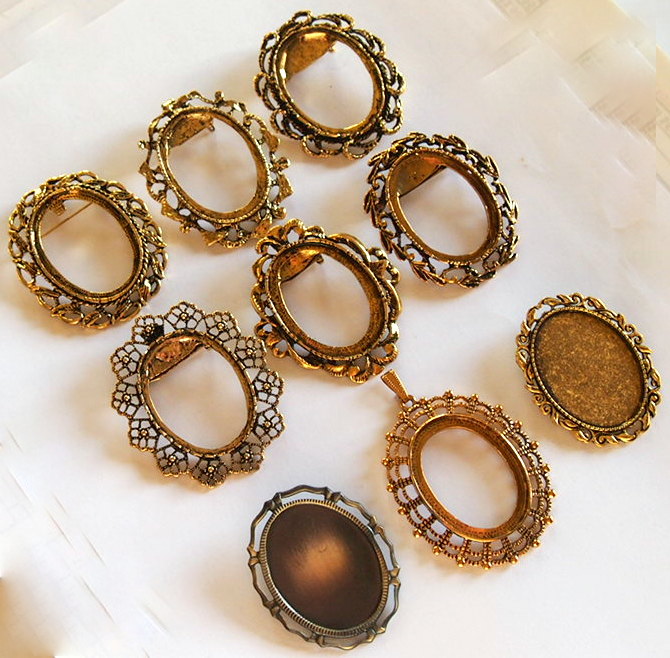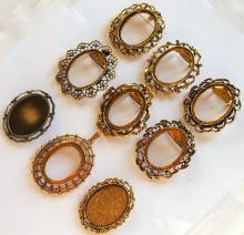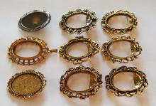 You are buying 9 Different 40 mm x 30 mm Antique Gold Plated Art Deco Pin/Pendant Brooch Settings. All of these settings were originally from some old 1900-1930's molds, I found a company to make these for me and they are gorgeous. These all (except for the middle one on the bottom row) have a pin back. You will not be disappointed in the quality, it is excellent and if I was setting any cameos or cabs, I would use these. These will work great for any cameos or cabs, they will have to be glued in. I have lots of Great Bails, Bracelets, Cameos, Chains, Connectors, Jump Rings, Lockets, Pendants, Pins, Rings & Settings so, just look at all my listings. All of these are offered in groups of 4 of each color. Starting with the top row left to right is the 40x30 mm Antique Gold Wreath & Floral Pin or Pendant Setting item #111316443210, next is the Old Victorian Twisted Vine Pin or Pendant Setting item #361460336419, next is Old Style Twisted Rope Wreath Pin or Pendant Setting item #361282140892, next row down is the Old Style Flower Wreath Pin or Pendant Setting item #360471679678, next is the Lefleur Design Pin or Pendant Setting item #110930805544, next is Old Style Leaves Wreath Pin or Pendant Setting item #360483121488, third row down is the Big Loop Pin or Pendant Setting item #360478422144, next is the Oval Antique Gold Lacy Pendant Setting and is a pendant setting and does not have a pin back, item #360483110540, and the last one is the 40x30 mm Antique Gold Wreath Pin or Pendant Setting item #111722076415. I also offer this same set of gorgeous settings in Antique Silver item #112451166587 as shown in the next to last picture. This is a great deal on a group of really well made gorgeous brooch pin/pendant settings. The last picture is a group of 12 different antique gold 40x30 mm settings that do not have pin backs that are also offered item #362009783224.
