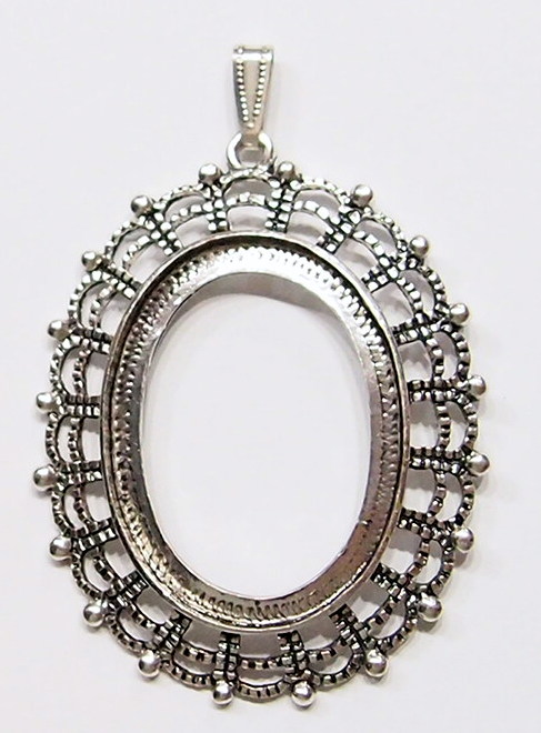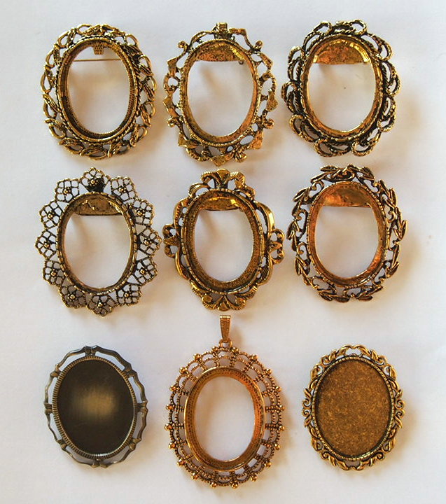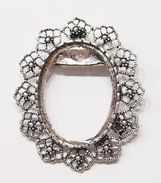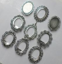 You are buying 9 Different 40 mm x 30 mm Antique Silver Plated Art Deco Brooch Pin or Pendant Settings. All of these settings were originally from some old 1900-1930's molds, I found a company to make these for me and they are gorgeous. These all (except for the middle one on the bottom row) have a pin back. You will not be disappointed in the quality, it is excellent and if I was setting any cameos, cabochons or glass, I would use these. Any of these will work great for cameos or cabs, they will have to be glued in. I have lots of Great Bails, Bracelets, Cameos, Chains, Connectors, Jump Rings, Lockets, Pendants, Pins, Rings & Settings so, just look at all my listings. All of these are offered in groups of 4 of each. Starting with the top row left to right is the 40x30 mm Antique Silver Wreath & Floral Pin or Pendant Setting item #110930805528, next is the Old Victorian Twisted Vine Pin or Pendant Setting item #110911243327, next is Old Style Twisted Rope Wreath Pin or Pendant Setting item #360621908094. Second row down is the Old Style Flower Wreath Pin or Pendant Setting item #360471675902, next is the Lefleur Design Pin or Pendant Setting item #360471675549, next is Old Style Leaves Wreath Pin or Pendant Setting item #360483157217. Third row down is the Big Loop Pin or Pendant Setting item #360478420756, next is the Oval Antique Silver Lacy Pendant Setting and is a pendant setting and does not have a pin back as shown in the 15th picture of all of the backsides of the settings, item #360481646887, and the last one is the 40x30 mm Antique Silver Wreath Pin or Pendant Setting item #361345050184. I also offer this same gorgeous group in Antique Gold item #112175736245 as shown in the next to last picture, sold separately. Which also means all of these are offered in groups of 4 of each in antique gold. This is a great deal on a group of really well made gorgeous brooch pin or pendant settings. I have a similar group of 10 gorgeous 40x30 mm Antique Silver plated pendant settings that do not have pin backs item #360944312815 as shown in the last picture, sold separately.