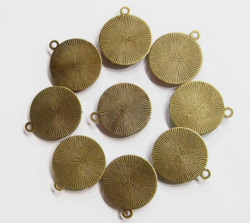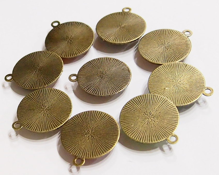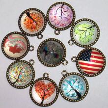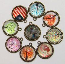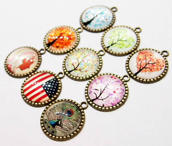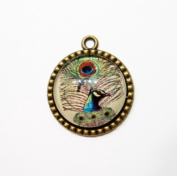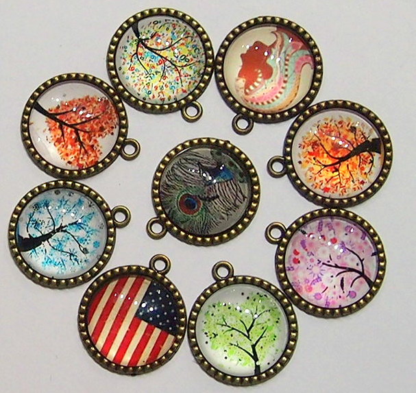 You are buying 9 different 30 mm Round Antique Gold Plated Ready to Wear Pendants. The top has a nice size loop (3.1 mm) for your Chain or Cord or Jump Ring (which I have 3 Colors & 2 Sizes of). You will receive 9 different Gorgeous Colors of these very nice looking and ready to either give as gifts or indulge yourself pendants. This group would let you have a different gorgeous pendant for each day of the week and then some. All of these are offered in groups of 2 of each color. The blue leaves is item #360691877405, the green heart shaped leaves item #111114531298, the orange heart shaped leaves item #360691893278, the orange fall colors item #360691862687, the multicolored item #360691864249, the purple leaves item #360691890702, the hippy art deco woman item #111230079073, the flag item #360471675581, and the peacock is item #360471675571. These are well made pendants with lots of brilliant colors in a gorgeous 30 mm Round Antique Gold setting. All of these beautiful pendants have a scalloped edge around the dome shaped cameo. These will make a great gift for yourself or that special someone. I have lots of Great Bails, Bracelets, Cameos, Chains, Connectors, Jump Rings, Lockets, Pendants, Pins, Rings & Settings so, just look at all my listings.