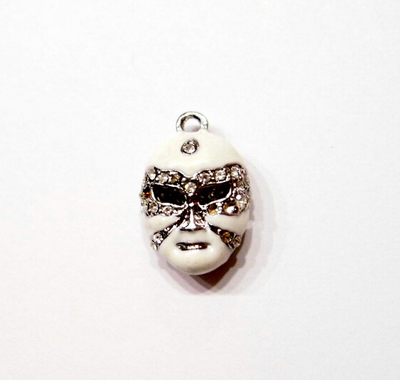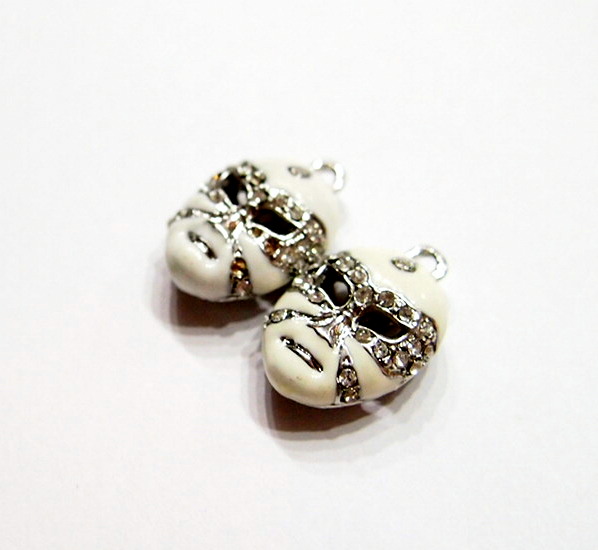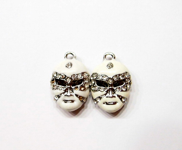 You are buying a White Color Mardi Gras Style Pendant, Earring or Charm Set. This is a very nice looking & well made set of either Pendants, Earrings or use them as Charms. These measure 23 mm x 16 mm including the loop at the top. The top has a nice size loop (2.7 mm) for your Earring Loop or you could put a Chain or Cord or Jump Ring (which I have 3 Colors & 2 Sizes of) through it. These are gorgeous with Crystals set in the Face & are made of metal & nicely painted. If you want to really be seen or noticed (as does everyone that goes to Mardi Gras)these are just what you need. These are nickel & lead free. I have lots of Great Bails, Bracelets, Cameos, Chains, Connectors, Jump Rings, Lockets, Pendants, Pins, Rings & Settings so, just look at all my listings. I also offer a White Mardi Gras Pendant & Matching Earrings Set that would have these included with a larger one of these to be worn as a matching Pendant. I have these in 5 other Colors, Purple, Black, Red, Turquoise, & Pink as shown in the last picture.
